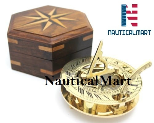 Nautical Solid Brass Round Sundial Compass with Design Rosewood Box, Brass