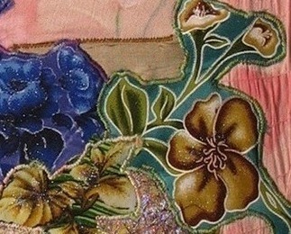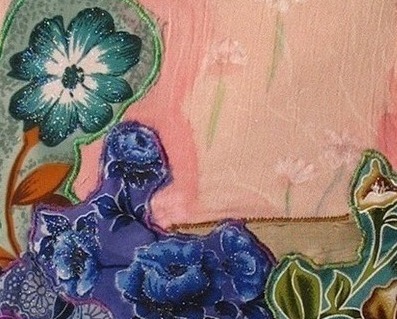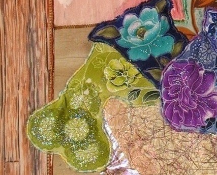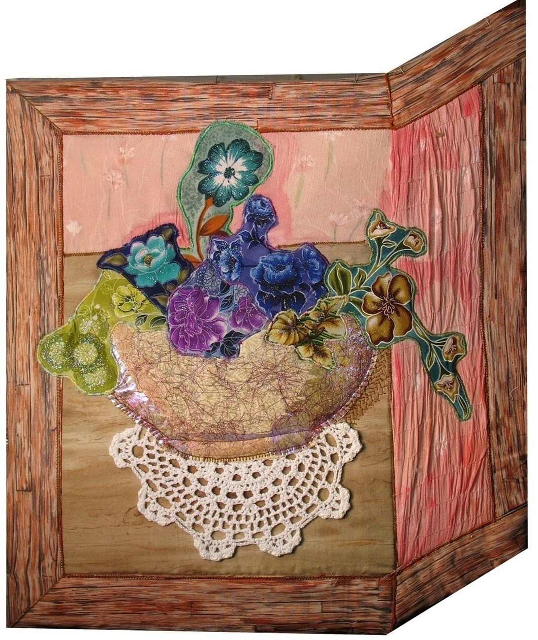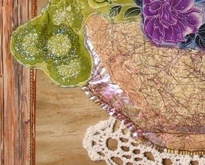 The flowers were cut from scraps of fabric I was given by a seamstress in a Mayan village on a trip to Belize. The doily is an actual crocheted one (not by me!) which I tried to stretch into an oval shape in another attempt to create a sense of dimension.