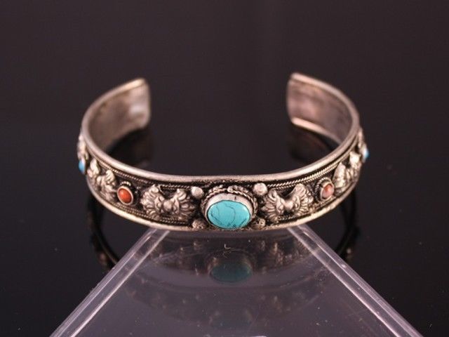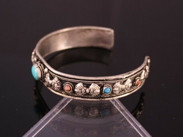 Tibetan Turquoise Red Coral Gemstone Carved 8 Vajra Double Dorje Cuff Bracelet