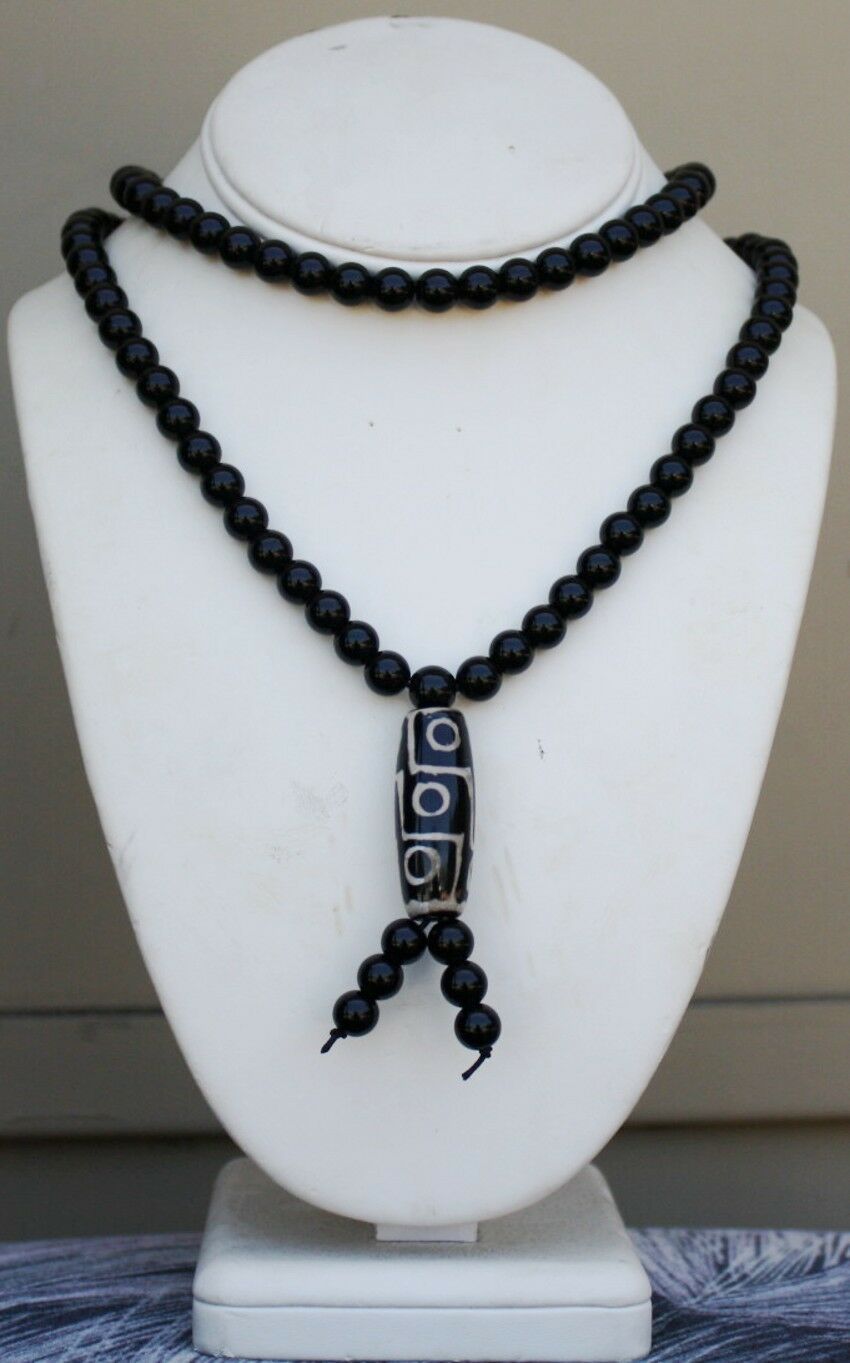 Long 108 8mm Black Agate Prayer Beads Mala Necklace 32" w 9-eye dZi