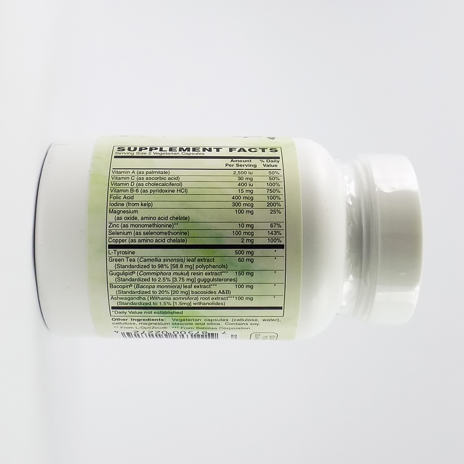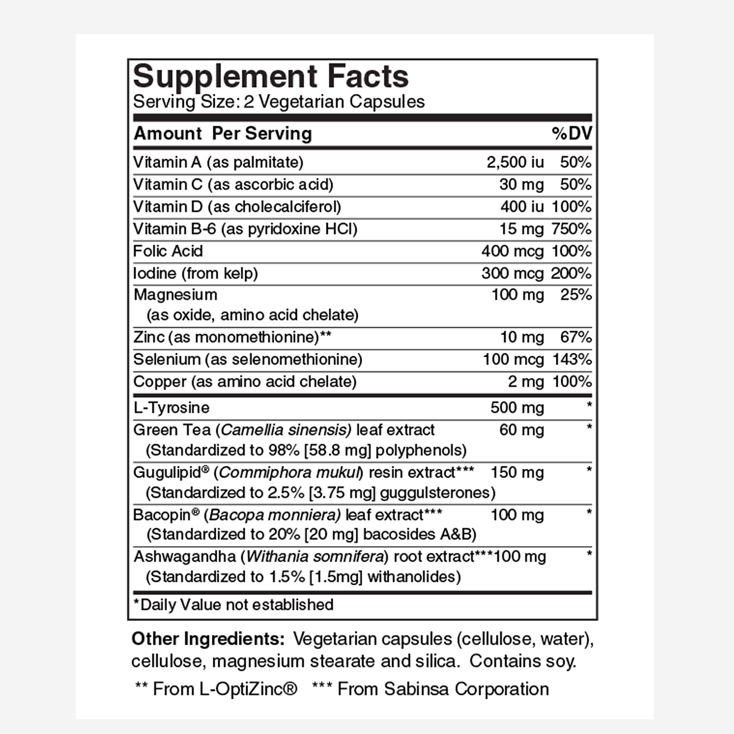 Vitamin A (as palmitate) Vitamin C (as ascorbic acid), Vitamin D (as cholecalciferol), Vitamin B-6 (as pyridoxine HCl), Folic Acid, Iodine (from kelp), Magnesium, (as oxide, amino acid chelate, Zinc (as monomethionine), Selenium (as selenomethionine), Copper (as amino acid chelate), L-Tyrosine, Green Tea (Camellia sinensis) leaf extract, Gugulipid (Commiphora mukul) resin extract, Bacopin (Bacopa monniera) leaf extract, Ashwagandha (Withania somnifera) root extract, Vegetarian Capsules: cellulose, water, magnesium stearate and silica. Contains soy.