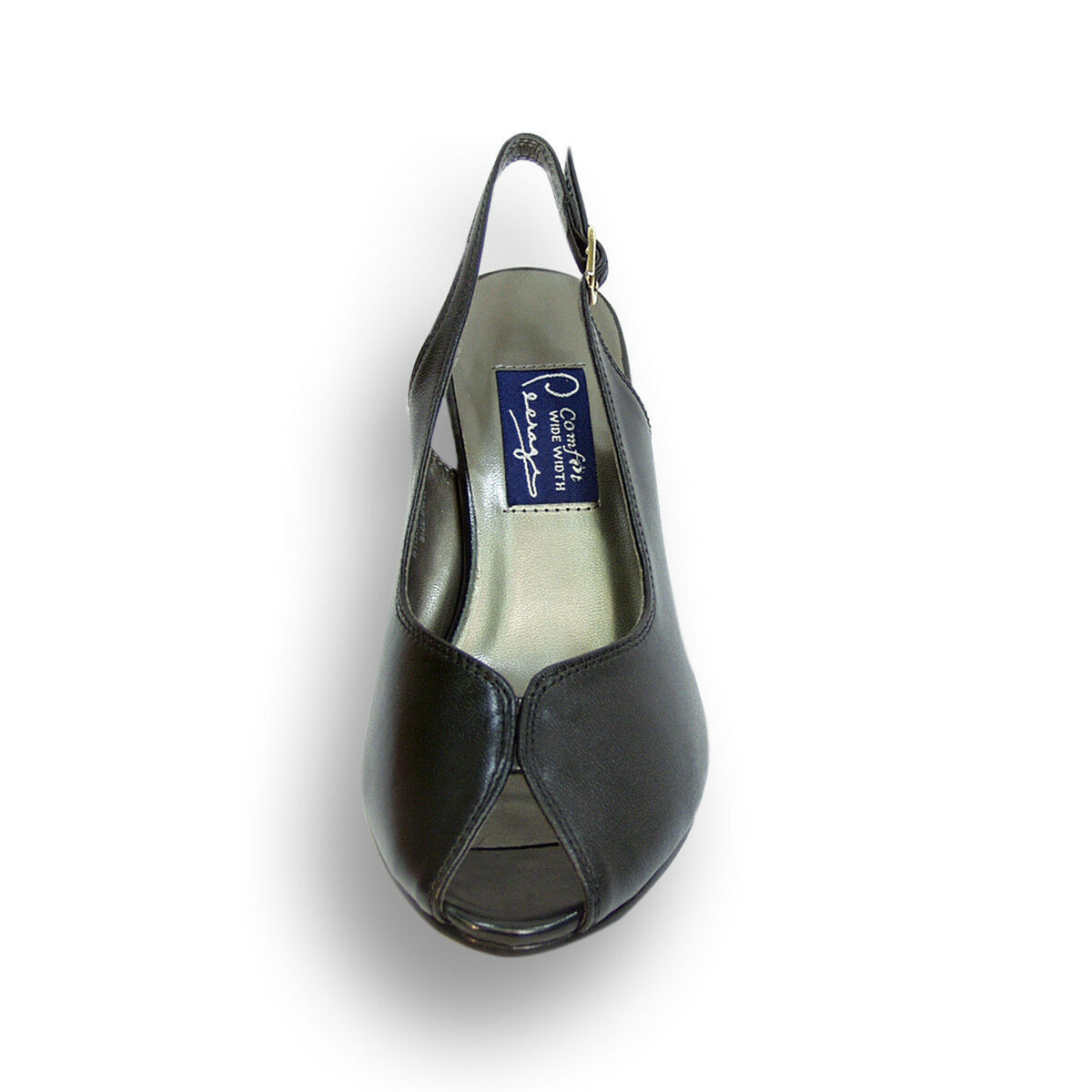 Be ready for work and happy hour in the PEERAGE Zara women extra wide width peep toe slingback. This ladies 2.5" mid-heel slingback with a buckle has a vamp cut out accented with a peep toe front and an all leather body for a night on the town after work.