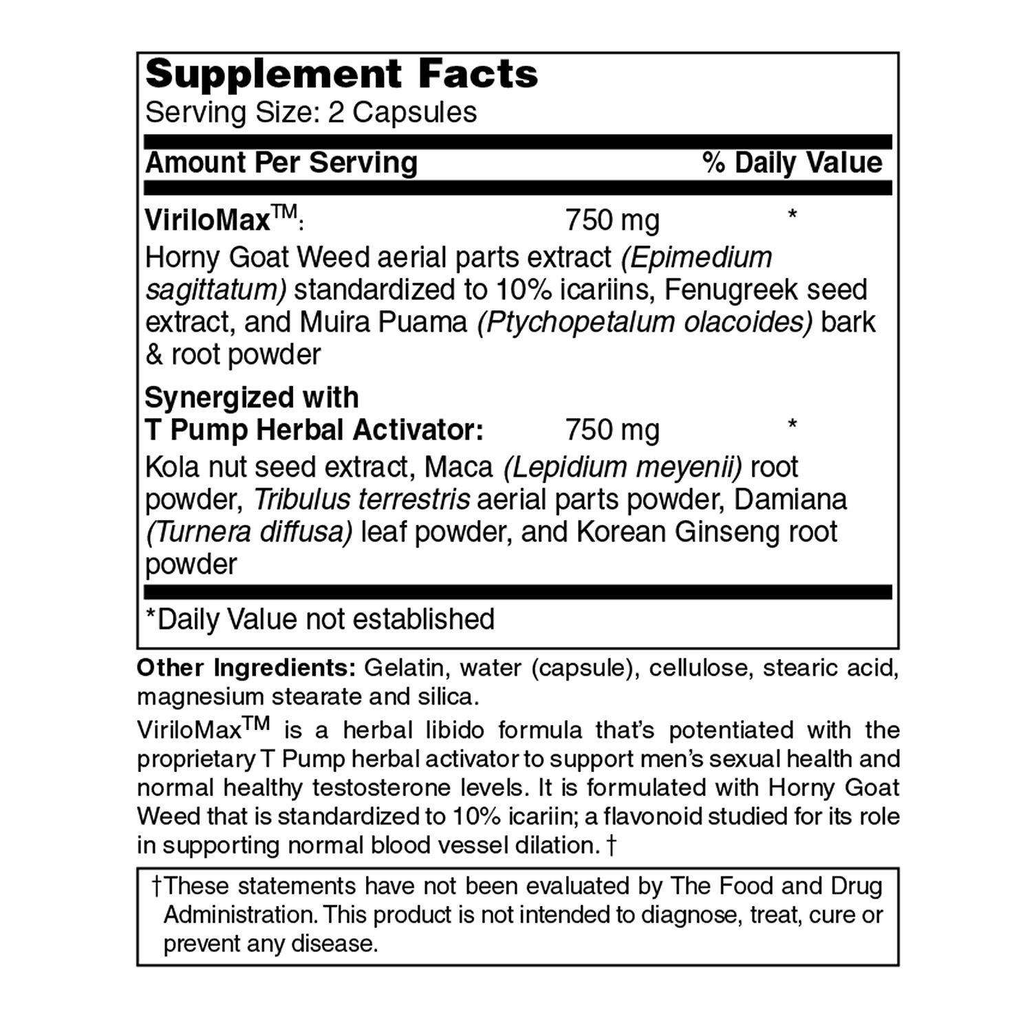 Horny Goat Weed aerial parts extract Epimedium sagittatum standardized to 10% icariins, Fenugreek seed extract, and Muira Puama (Ptychopetalum olacoides) bark root powder, Synergized with T Pump Herbal Activator, Kola nut seed extract, Maca (Lepidium meyenii) root powder, Tribulus terrestris aerial parts powder, Turnera diffusa leaf powder, and Korean Ginseng root powder. Other Ingredients: Gelatin, water (capsule), cellulose, stearic acid, magnesium stearate and silica.