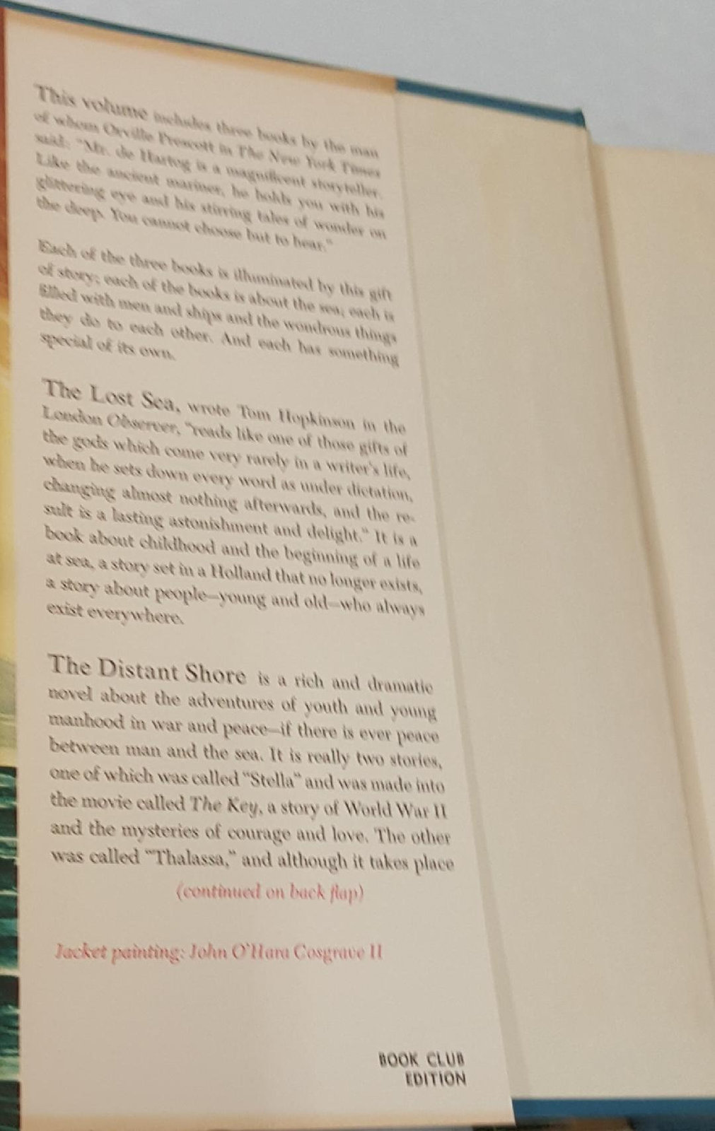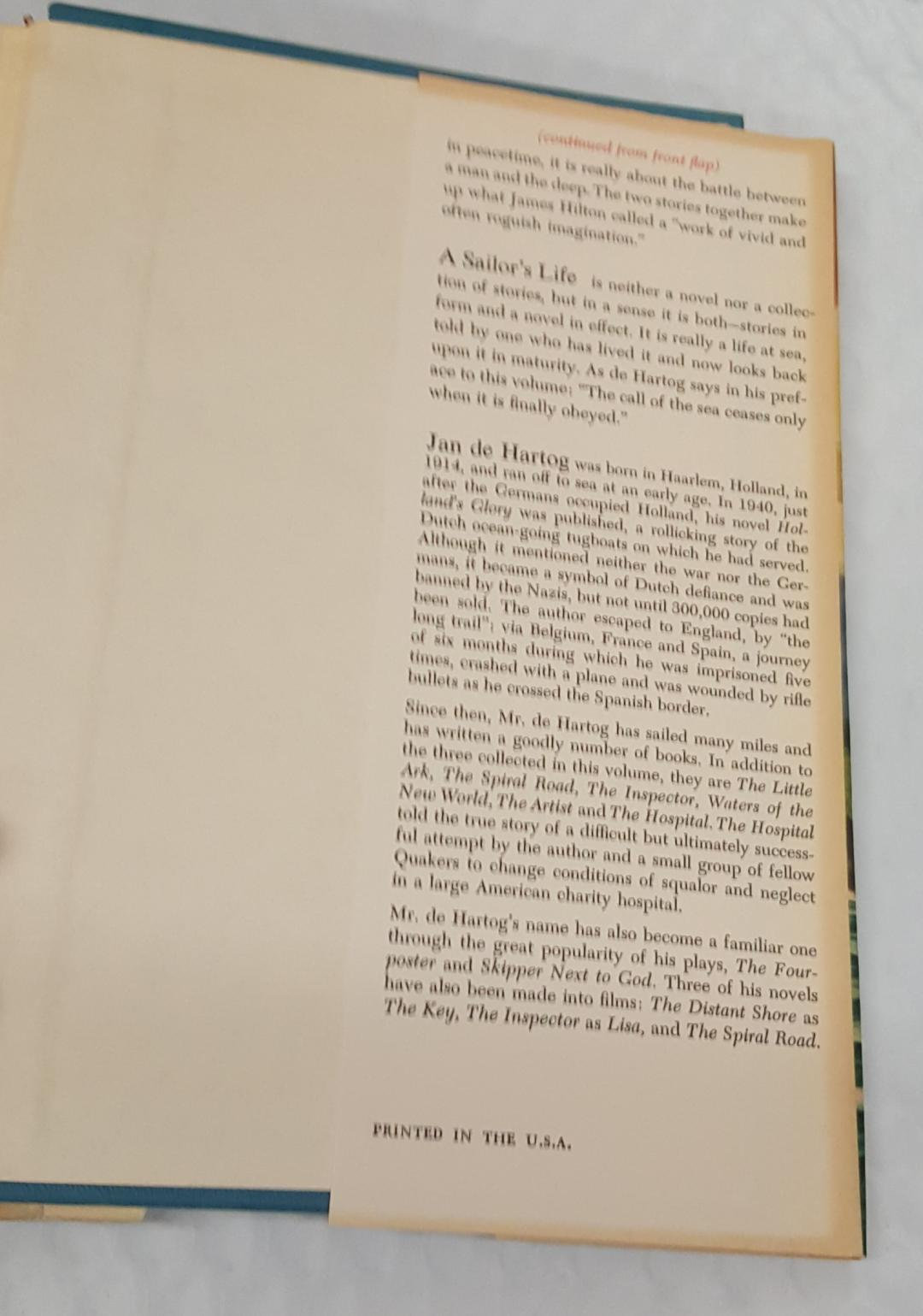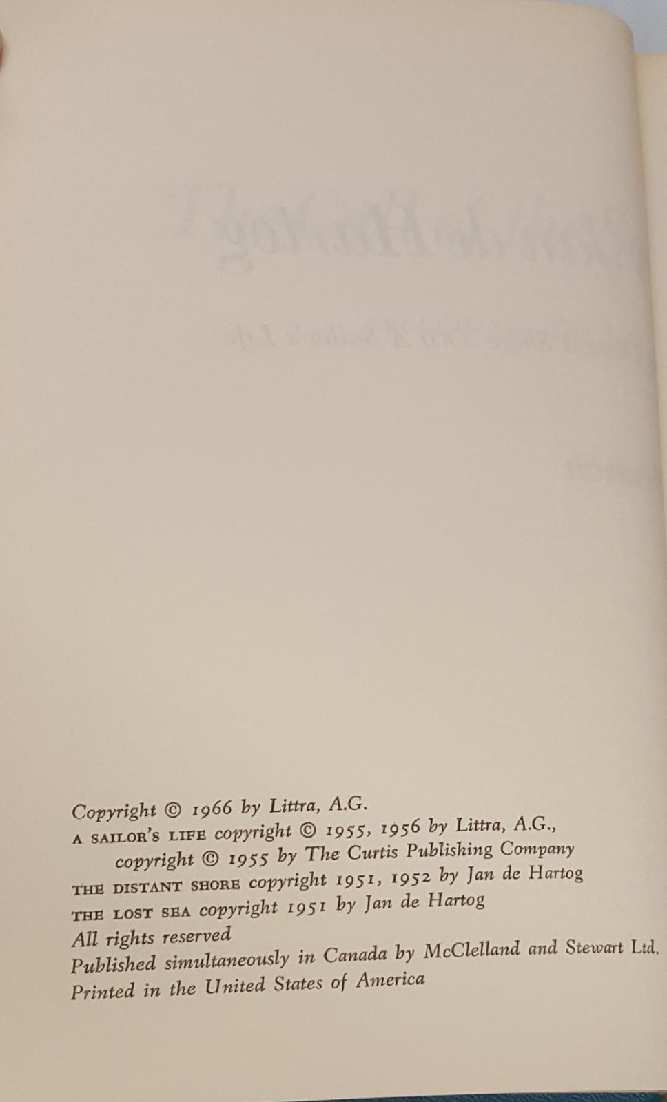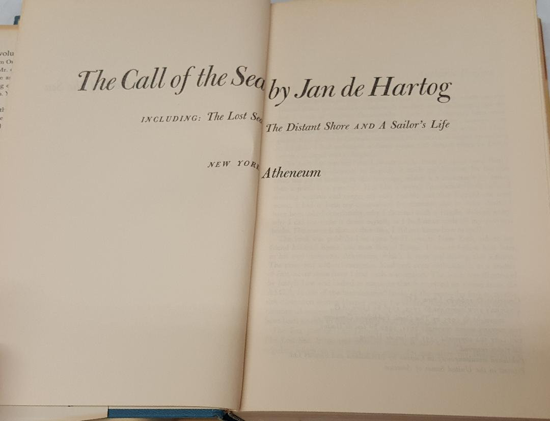 The Call of the Sea including The Lost Sea, The Distant Shore and A Sailor's Life by Jan de Hartog. Jacket painting by John O'Hara Cosgrove II. This is book club edition published in 1966. Pages are tanning with age but no writing or tears. Dust jacket has a beautiful picture on it. There is some scuffing, especially along the edges, and a tear on bottom of back jacket. Overall is in very good shape for a book of this age.