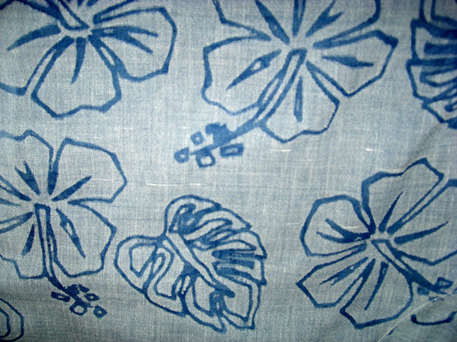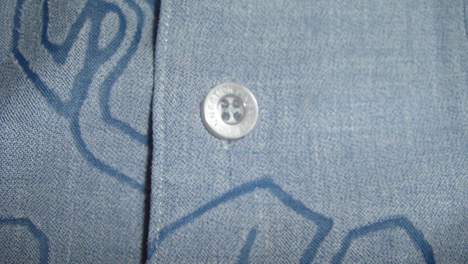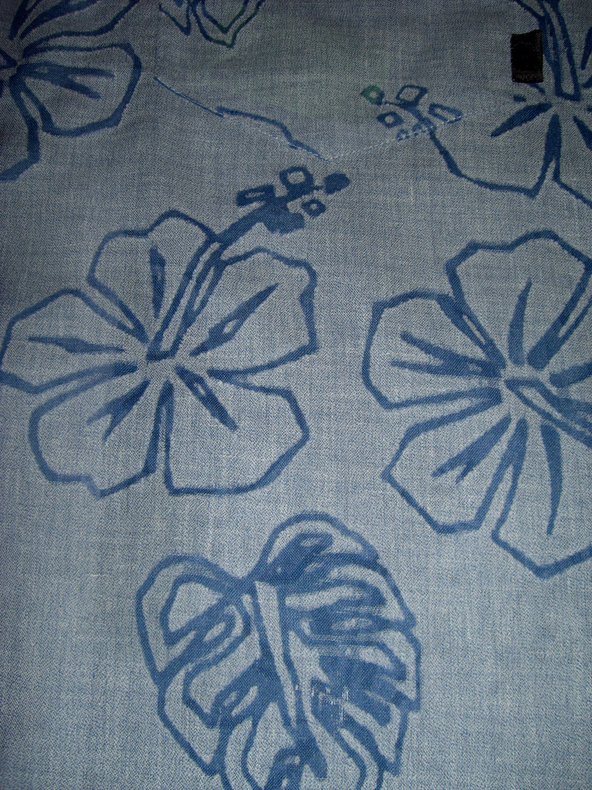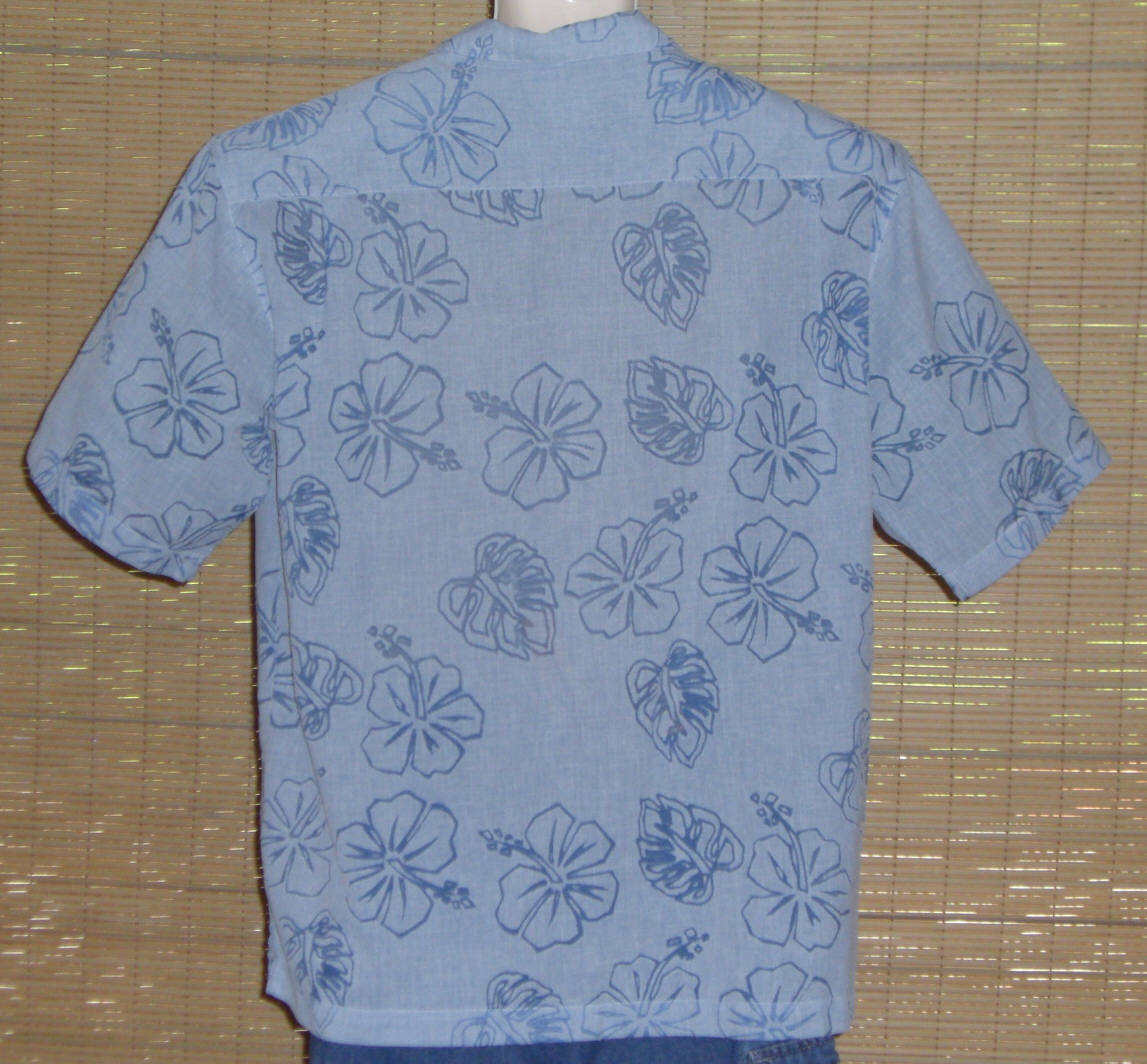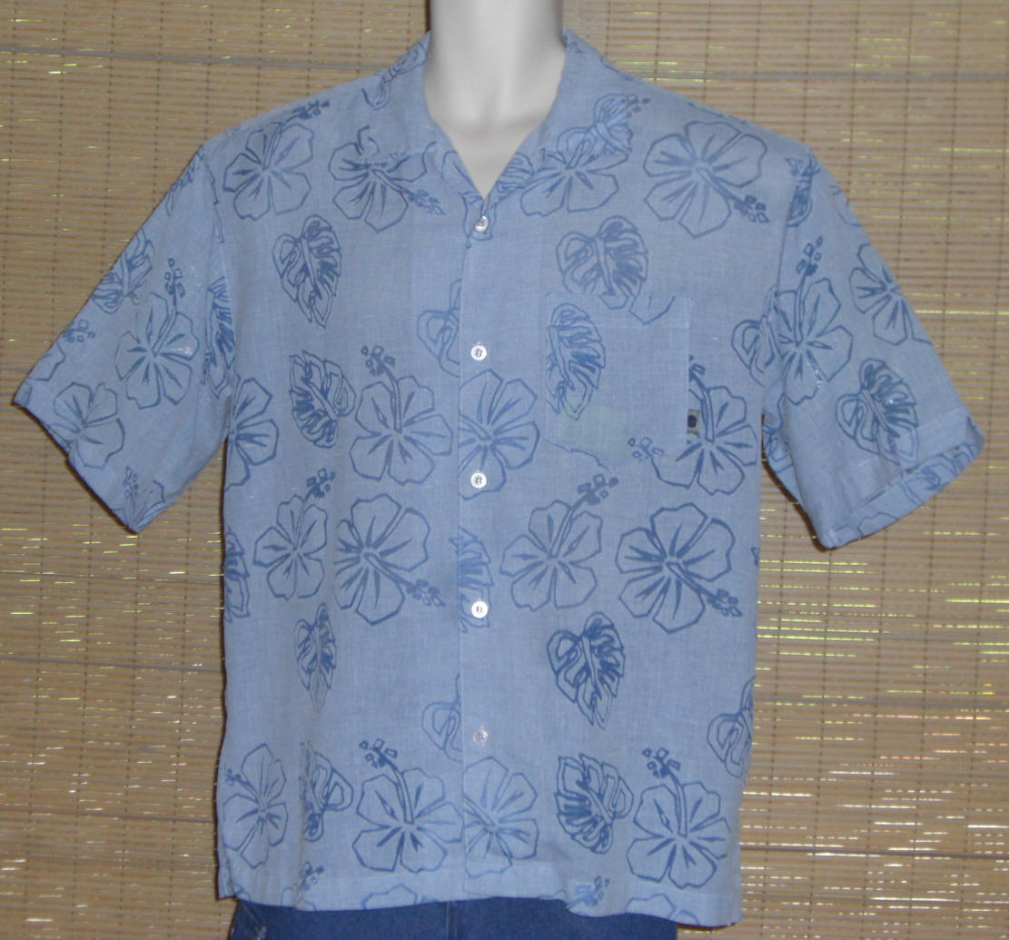 Light blue background with darker blue tropical flowers and leaves. Custom logo white plastic buttons and 1 breast pocket with logo tab.