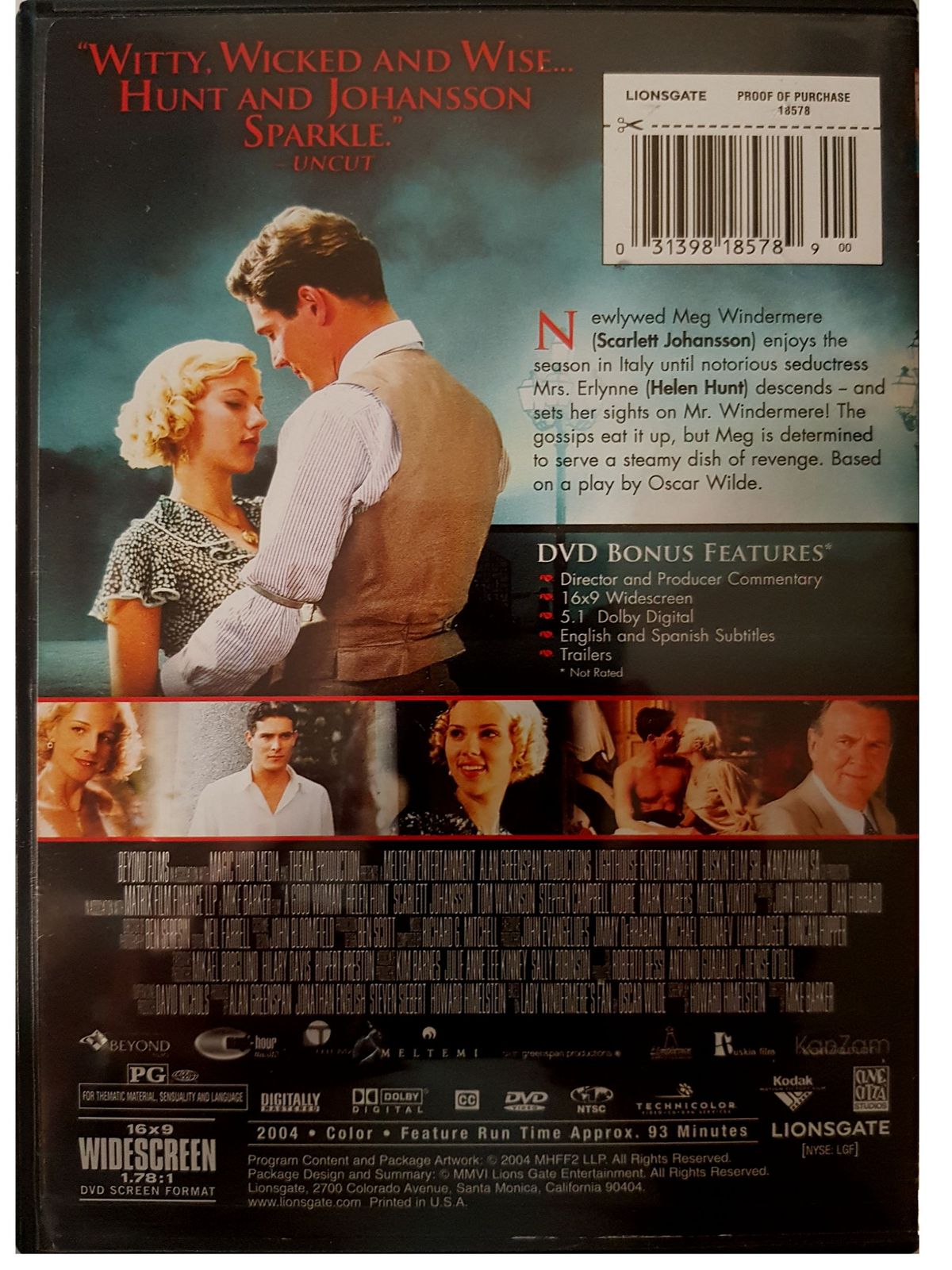 Having scorned every member of the New York upper class, the seductive Mrs. Erlynne (Helen Hunt) travels to Amalfi, Italy, hoping to win over a married aristocrat, Robert Windermere (Mark Umbers). When news of their flirting becomes a scandal, Windermere's innocent wife, Meg (Scarlett Johansson), plots an elaborate revenge, despite her own attraction to the young Lord Darlington (Stephen Campbell Moore). At Meg's 20th birthday party, all illicit desires come to the surface.