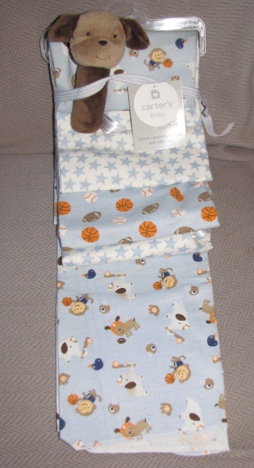 CARTERS BABY BOY PUPPY DOG STICK RATTLE STAR SPORTS MONKEY RECEIVING BLANKET NEW