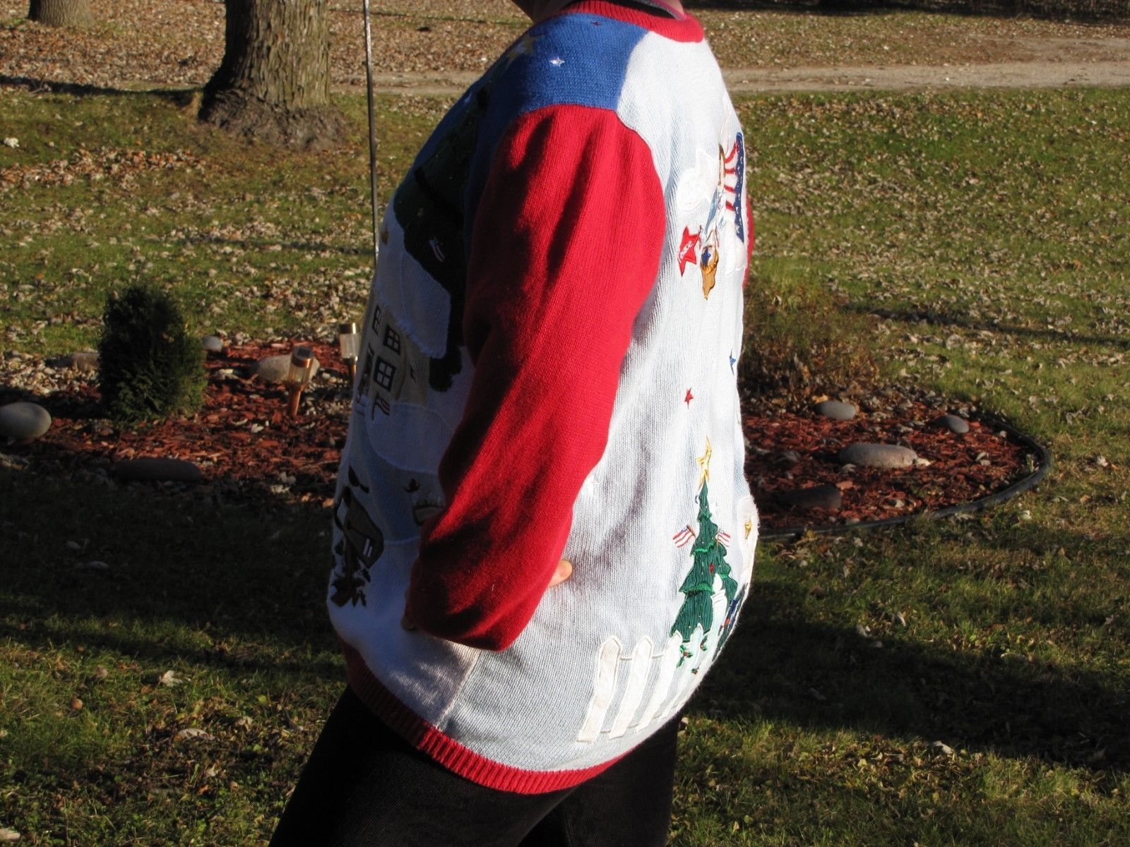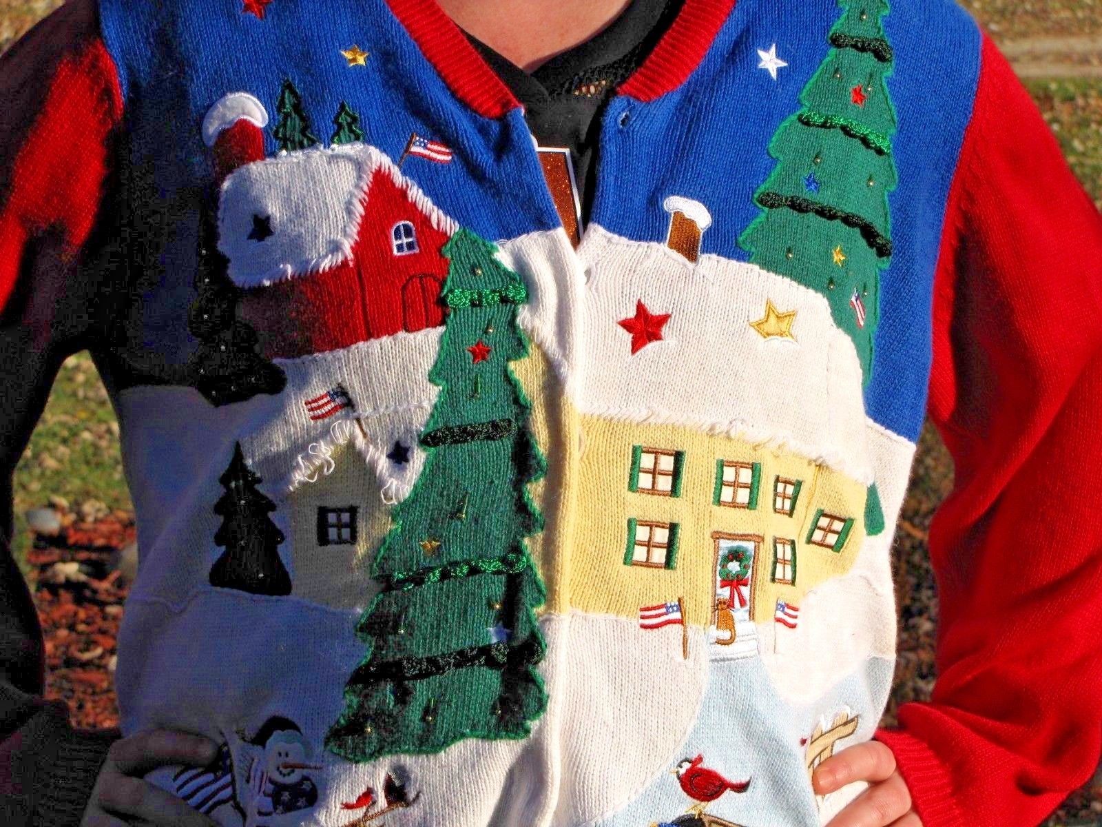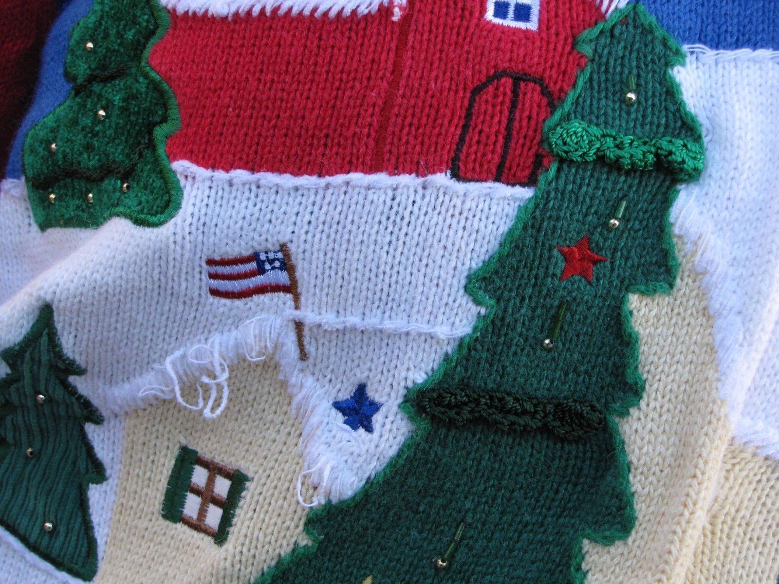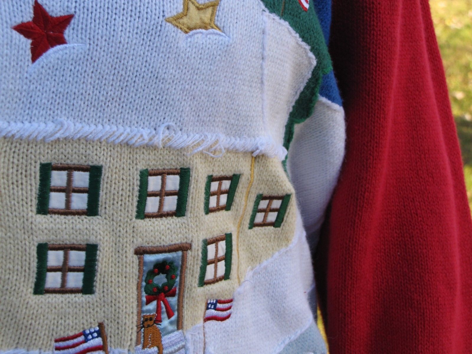 Color/pattern: Blue with Red Sleeves; Applique and Embroidered Snowman, US Flag, Angel, Christmas Tree, American Village