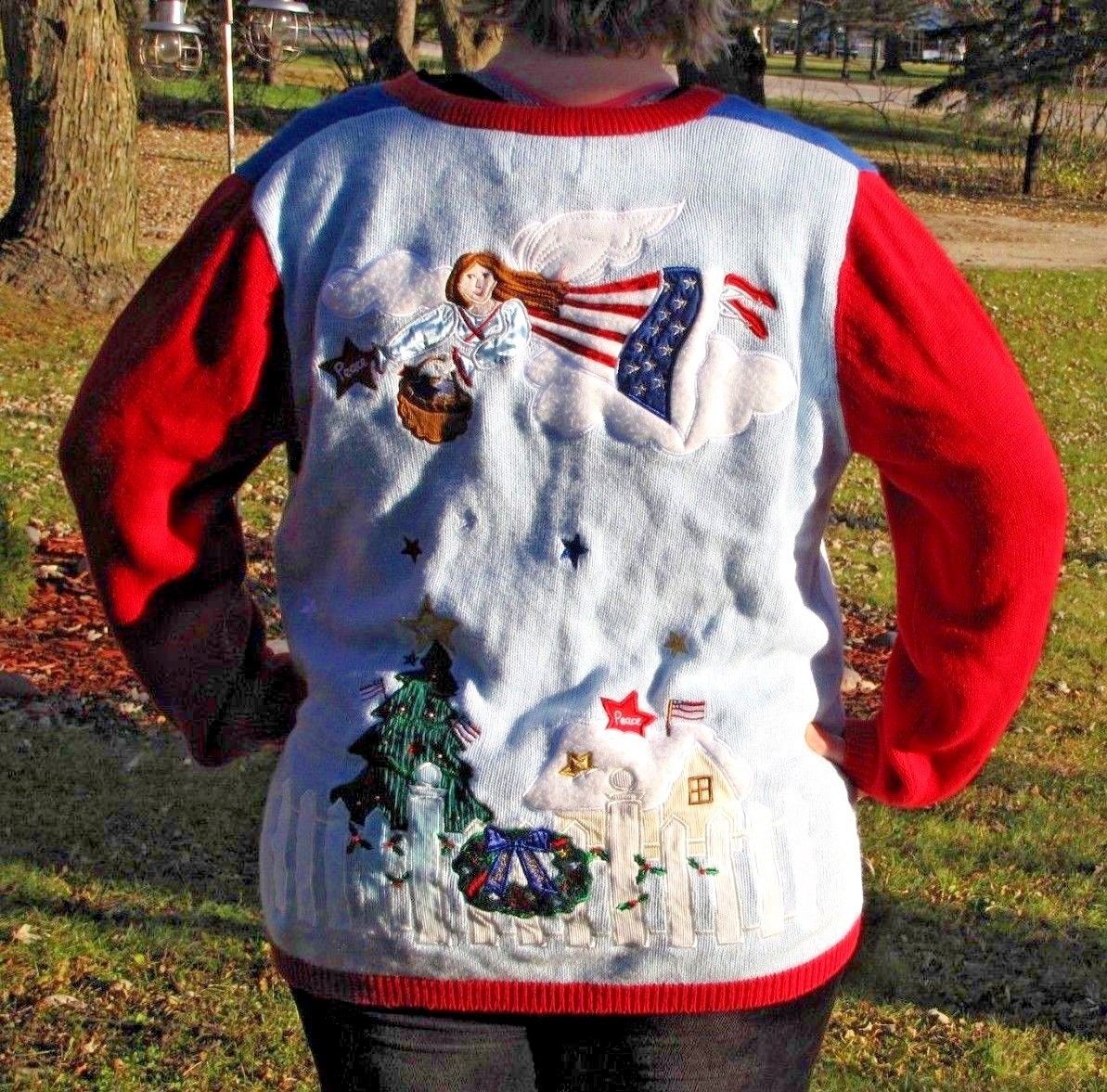 Quacker Factory Plus Sz 1X Ugly Christmas Sweater American Village US Flag Vtg