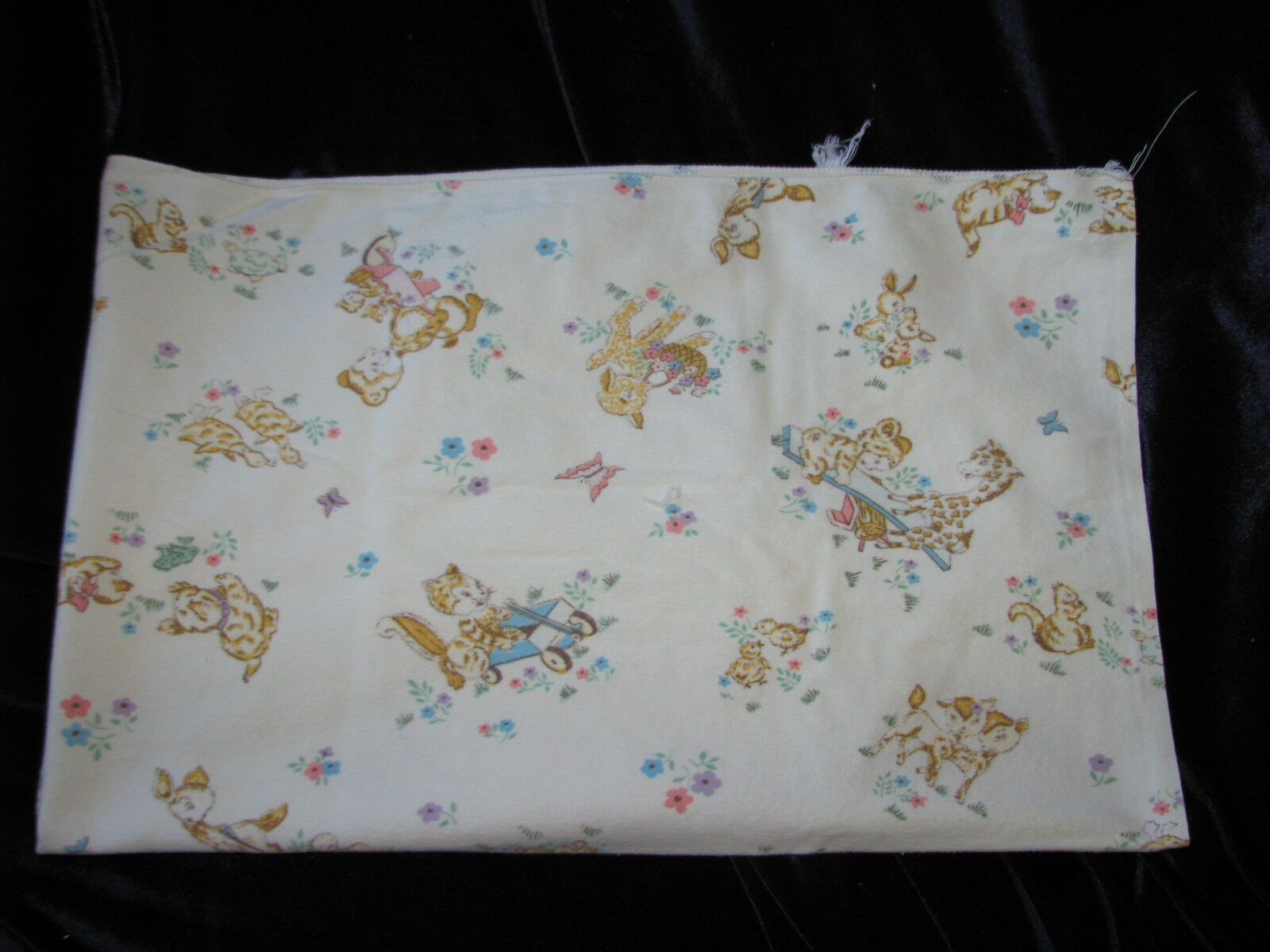 VINTAGE BABY BLANKET LAMB BUTTERFLY BUNNY CAT BEAR GIRAFFE CHICK DUCK FLOWER PUPPY FROG TURTLE SQUIRREL LAMB SHEEP DEER FAWN DOE TEDDY BEAR, CREAM COLORED, UNISEX, COTTON FLANNEL, HOSPITAL RECEIVING / SWADDLING STYLE 39" X 25"