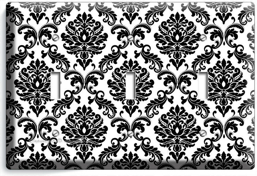 BLACK AND WHITE DAMASK MOTIVE LIGHT SWITCH 3 GANG WALL PLATE ROOM HOME ART DECOR