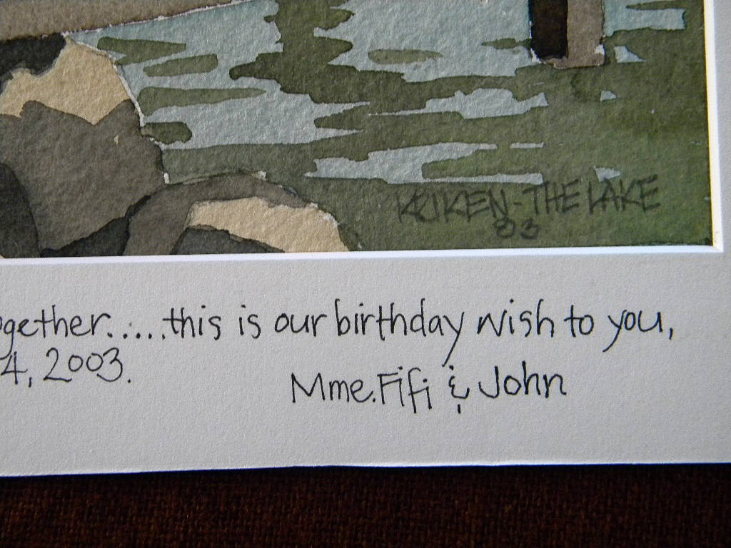 Vintage watercolor painting by a well known urban designer and architect, Founder and President of the Sunday Afternoon Watercolor Society in San Francisco, John Lund Kriken "The Lake" 1983. Solid wood frame, glass, single matted. 13" X 13". The painting was gifted to Sue Bender in 2003 by the artist and his wife. There is a gift message right on the mat. Excellent condition.