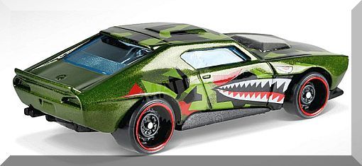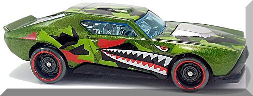 Description: Mtlflk Olive Green, w/Chrome interior, Blue windows, Light Green, Black and Red camo pattern on hood, side roof, Red and White eye teeth w/Red tongue on sides, Two vertical White stripes on rear driver side, White 'Dima', Light Green 'A-REK' on left door, White ‘Hot Wheels’ logo on left rear fender, Black Malaysia Base, w/BlkST8SL’s. 051919-051919P-D36