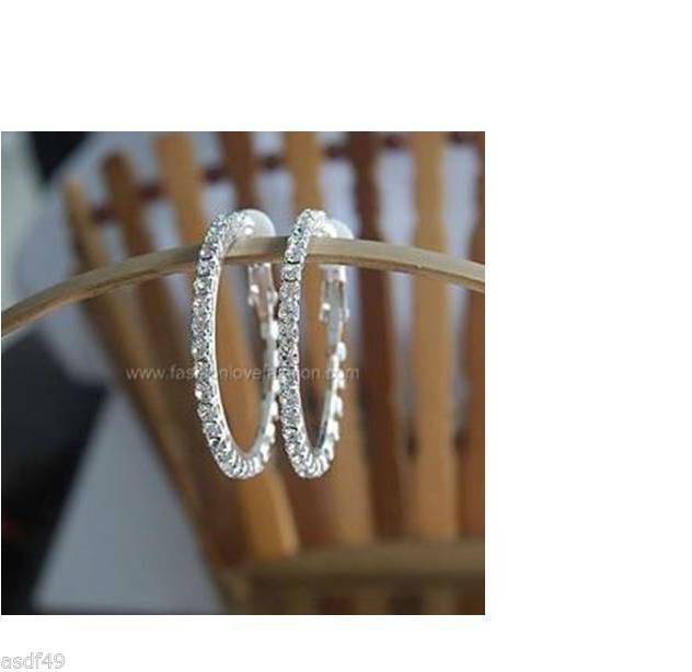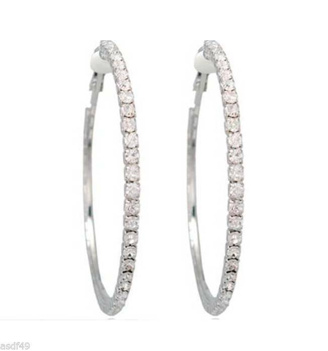 1 Pair Silver Clip On Rhinestone Hoop Earrings,X Large 2 1/2" Or 65 MM