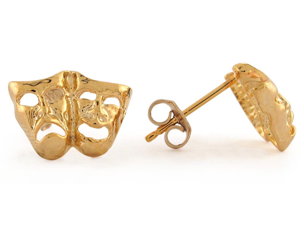 The twin masks of Tragedy and Comedy are cast from fine 10k or14k Yellow Gold and made into these gorgeous stud earrings. They make a great gift for those with a passion for the arts, especially theater. Originally used by actors in Greek theater to exaggerate emotion or play multiple characters, the masks have evolved into a prevalent symbol of not only theater, but of life itself. So be happy now and get your hands on a pair, or cry later because you missed your chance. This pair of earrings measures 1.3cm in length.