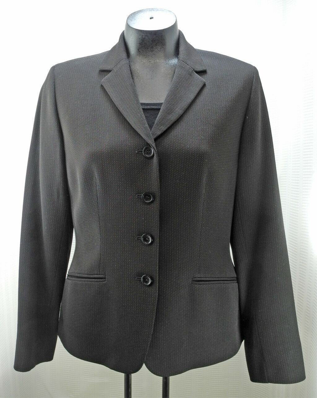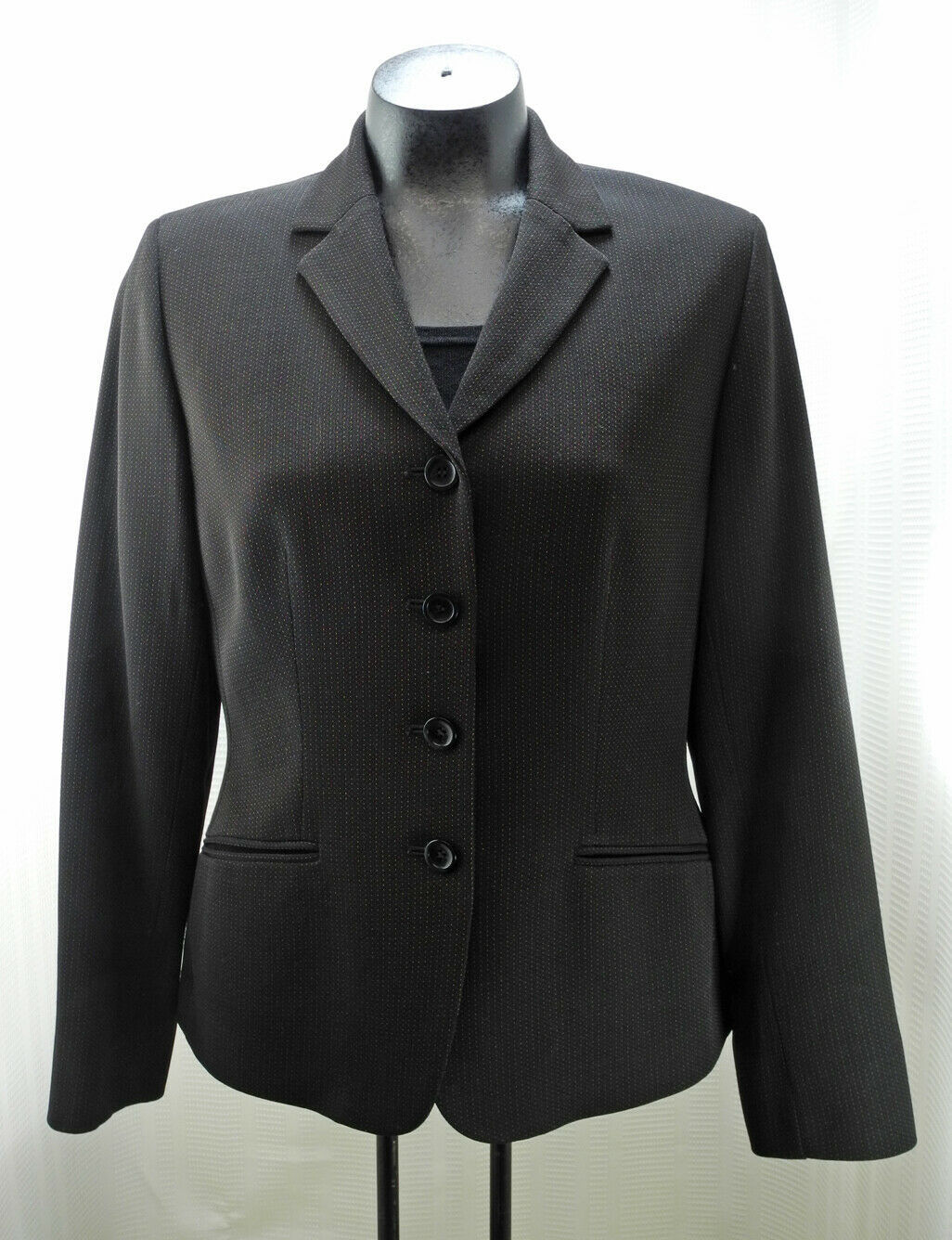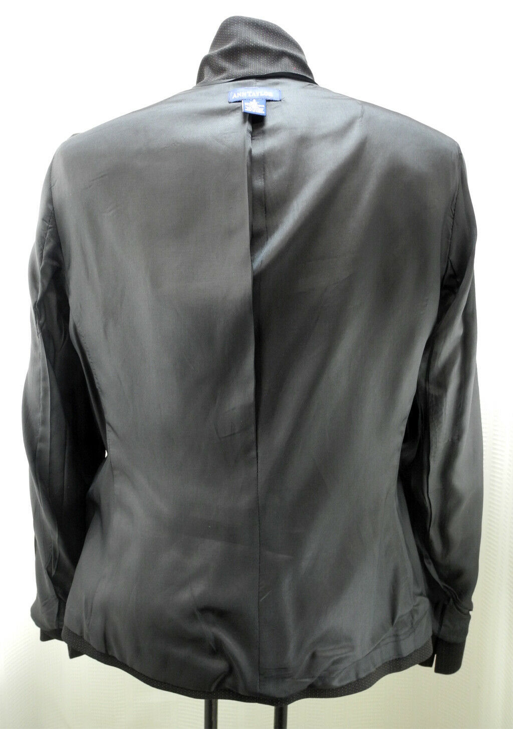 Ann Taylor wool blend blazer is in excellent condition, gently worn. Black with red and tan ticking and four-button front. Fully lined with long sleeves and two welt hand pockets, one of them is still basted. Please see the pictures for all the details.