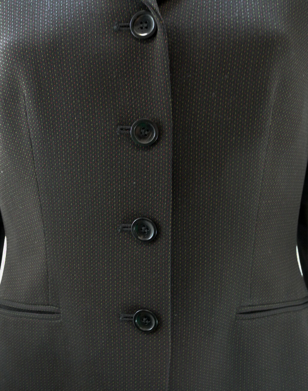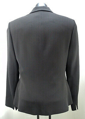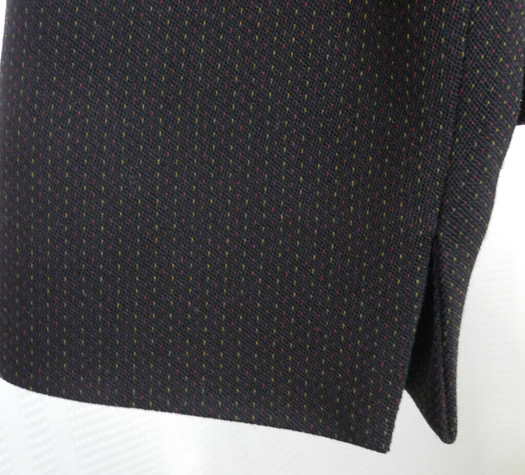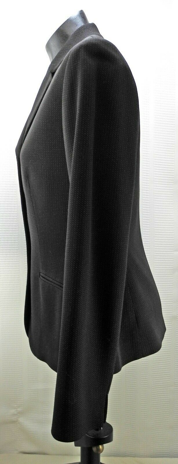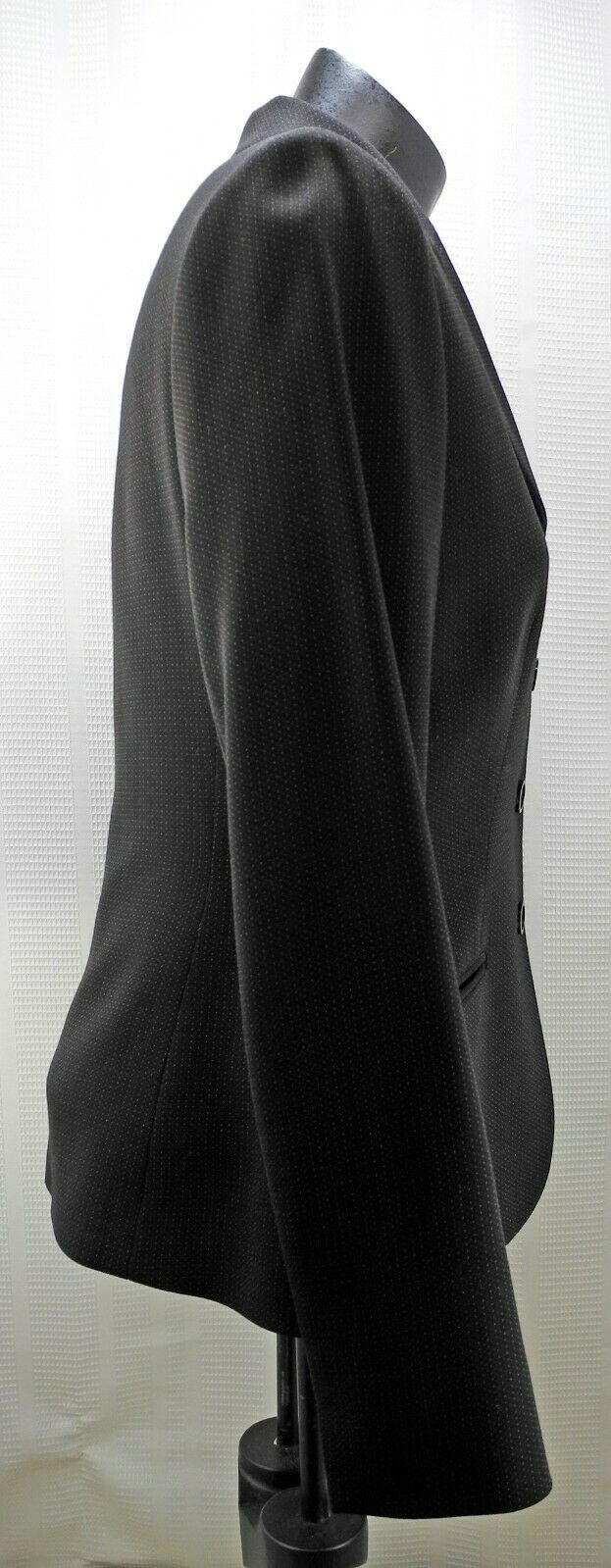 Ann Taylor wool blend blazer is in excellent condition, gently worn. Black with red and tan ticking and four-button front. Fully lined with long sleeves and two welt hand pockets, one of them is still basted. Please see the pictures for all the details.
