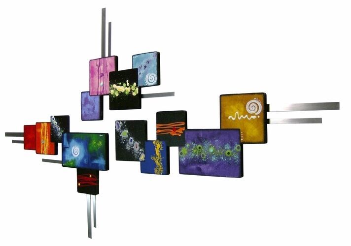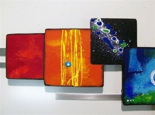 Colorful Vibrant Handpainted 3pc Abstract Square Wood Wall Sculpture w/Metal