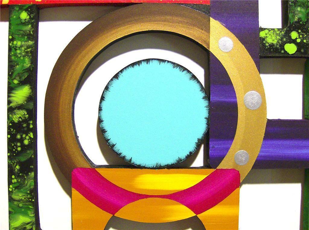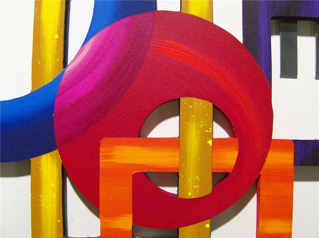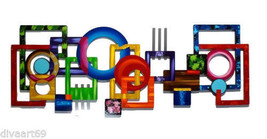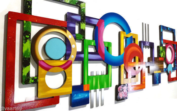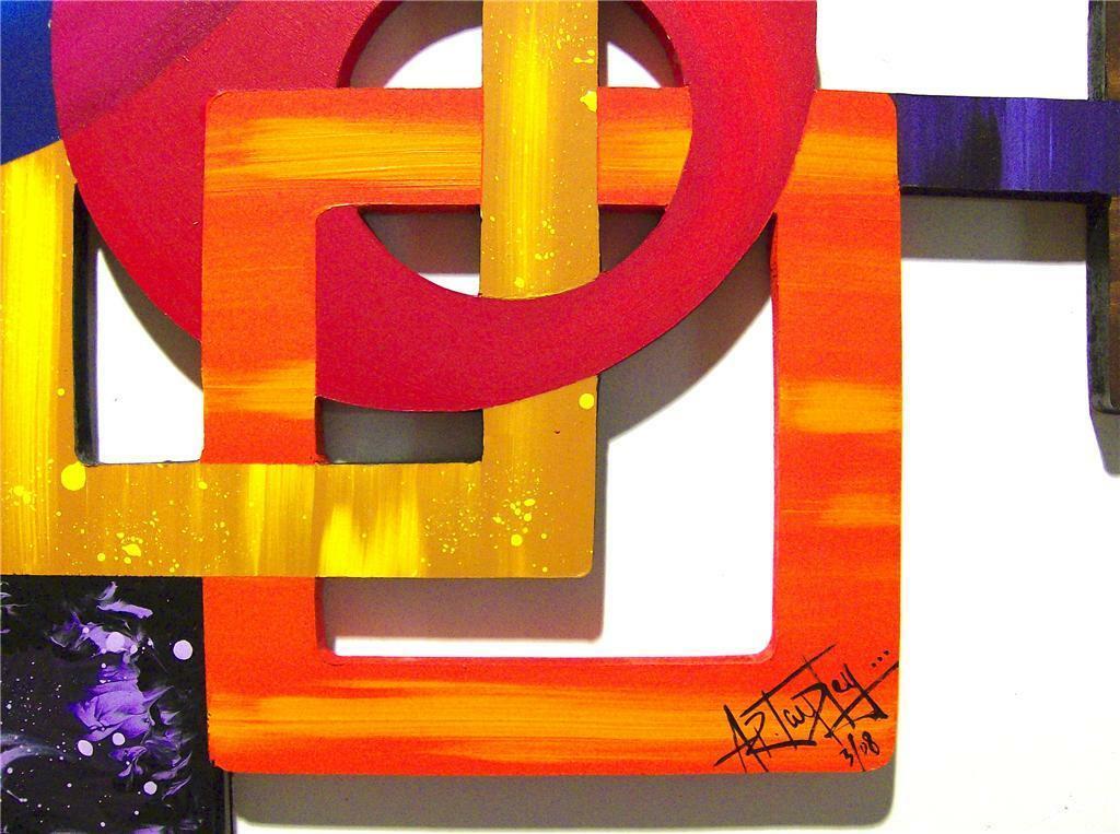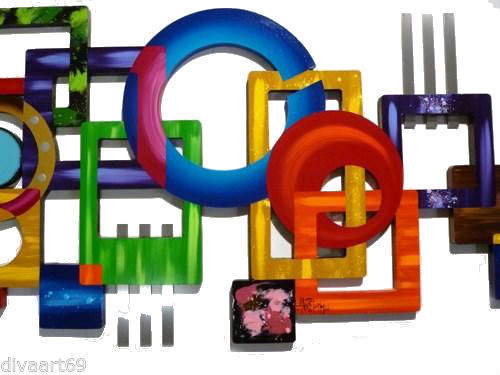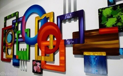 This original sculpture was meticulously designed cut from 1/2" mdf wood. It features (6) shiney 8" aluminum metal strips which accent a vibrant display of intertwined geometric shapes. It's hand painted in my own usual style giving a unique fun but sophisticated style with a dimensional look!