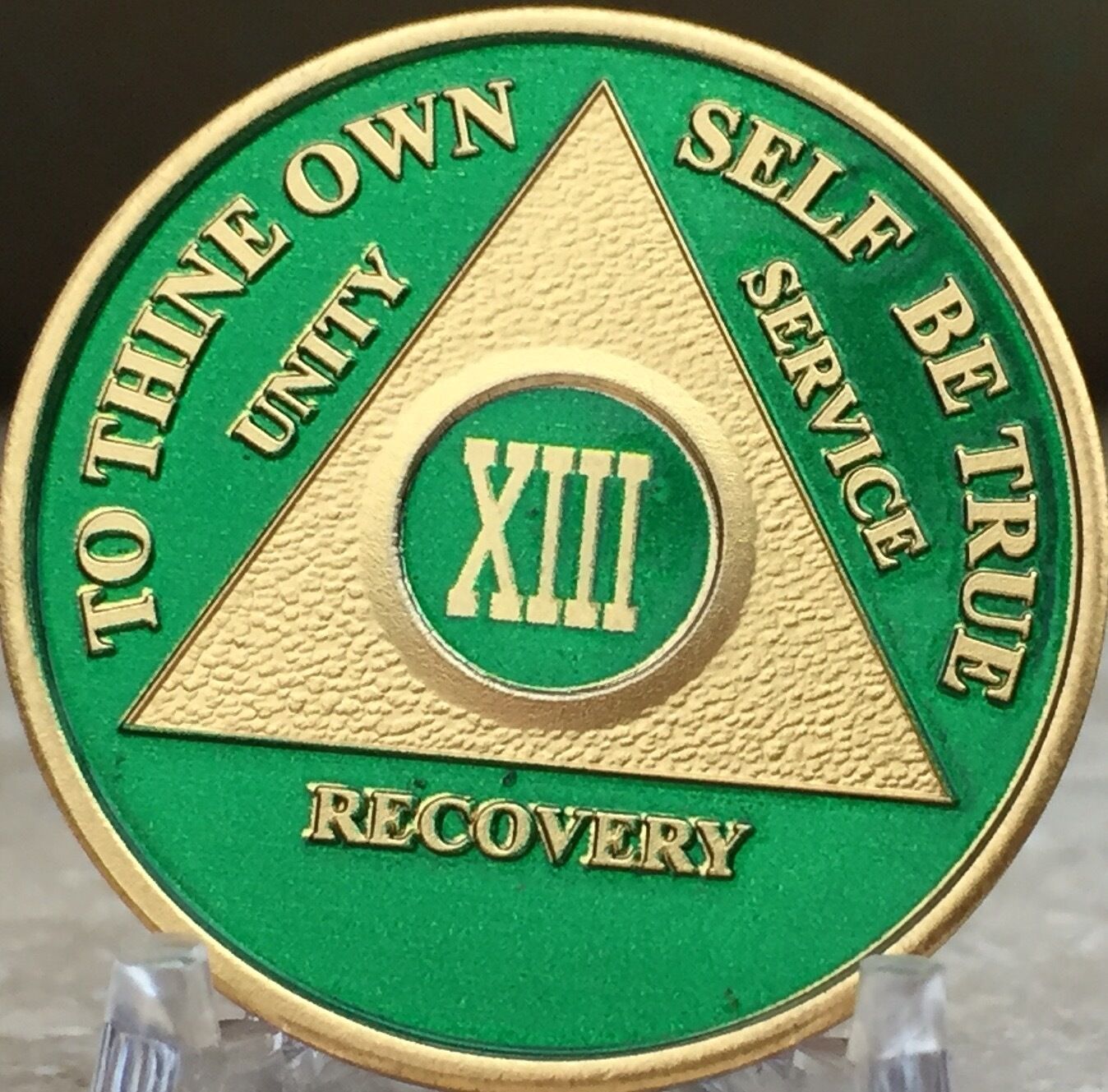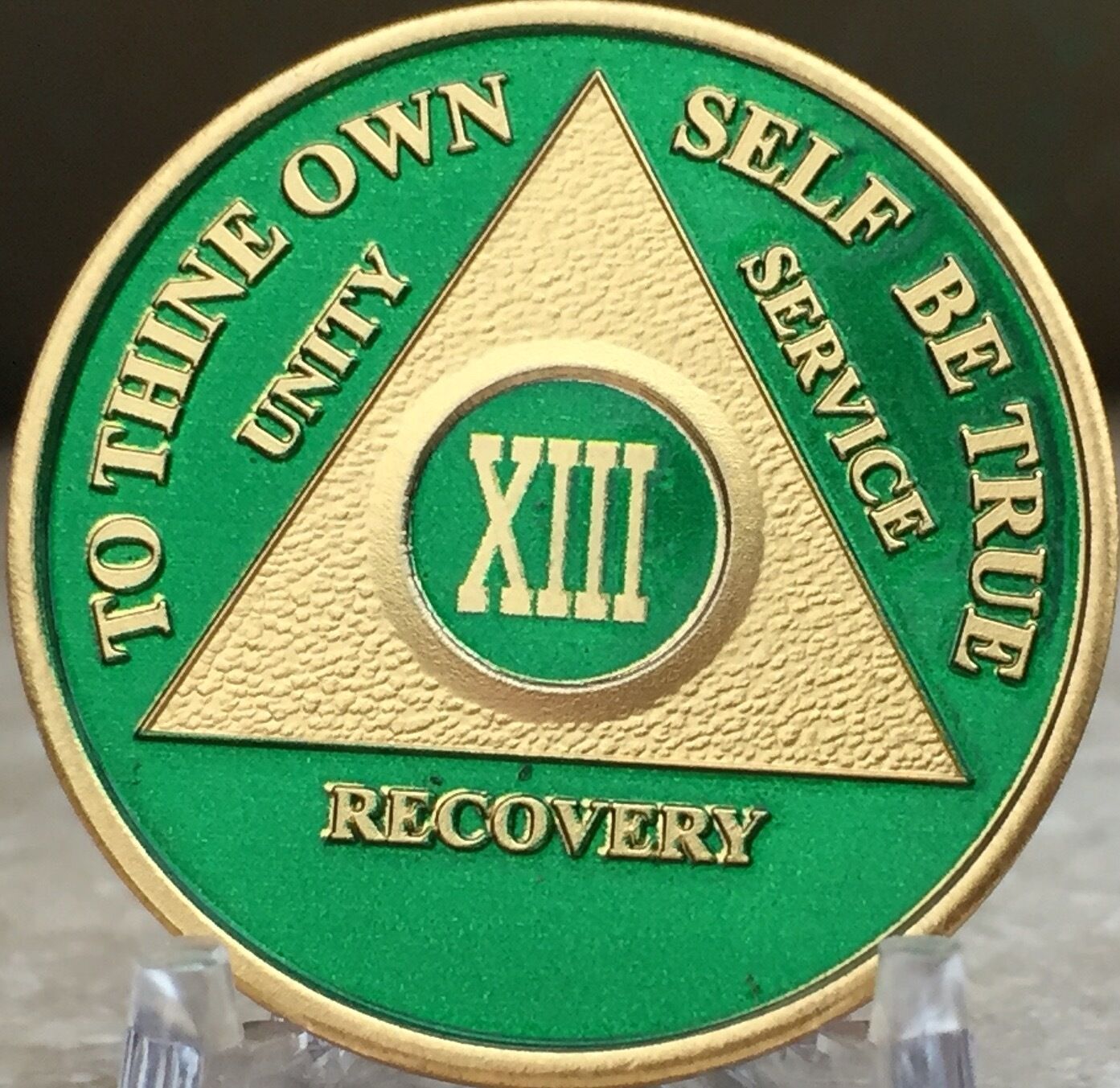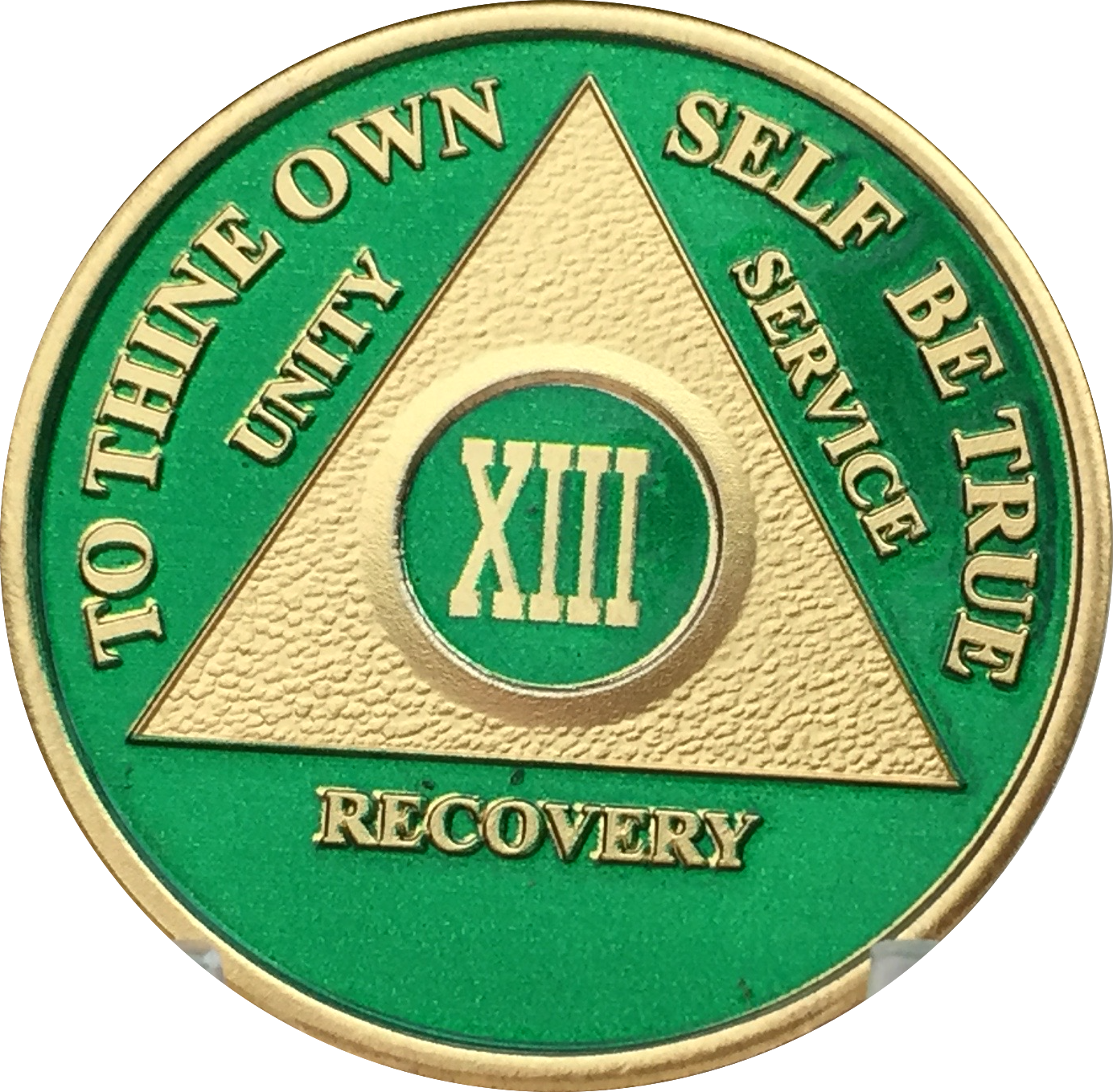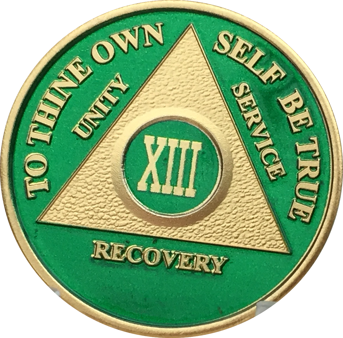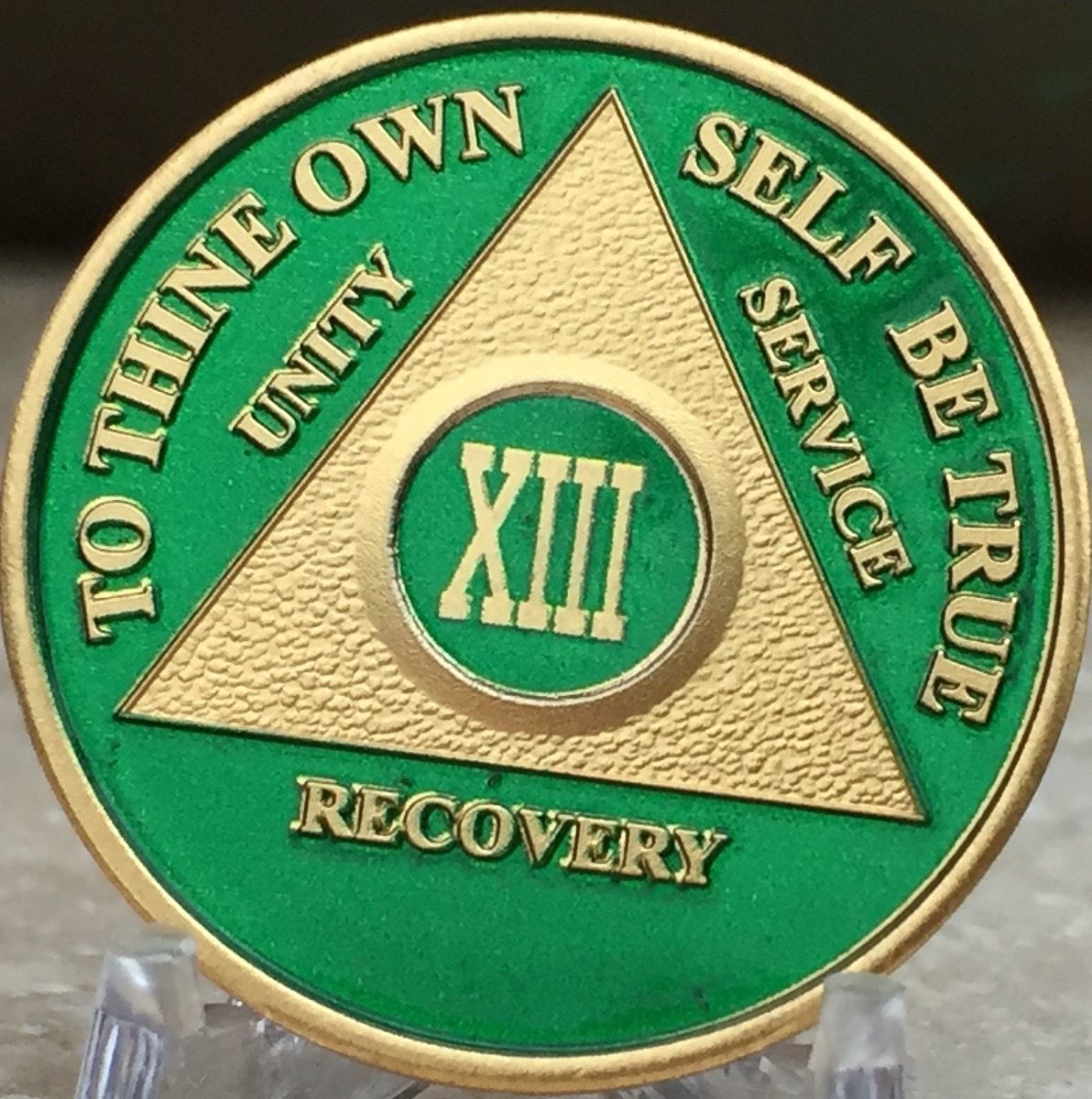 13 Year AA Medallion Green Gold Plated Alcoholics Anonymous Sobriety Chip Coin