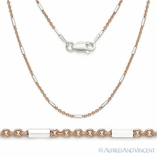 The featured Italian-made chain necklace is made up of 1.3mm classic cable links 3mm bar links cast in solid .925 sterling silver plated with 14k rose gold then finished with a lobster clasp for secure wear.