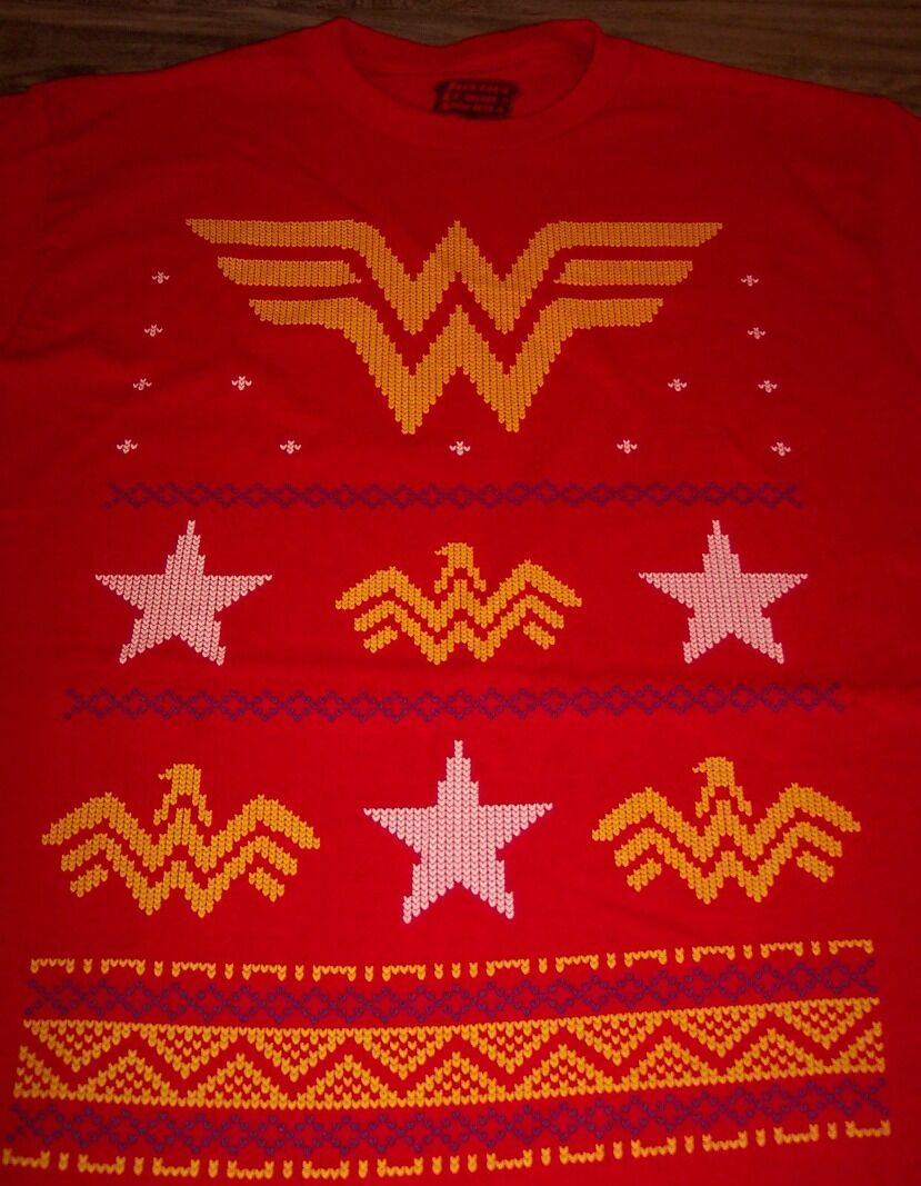 This is a DC COMICS WONDER WOMAN Justice League CHRISTMAS T-shirt. It is a size SMALL, and it is NEW. It is 17 inches from armpit to armpit and 28 1/2 inches in length. Really Cool Shirt. The print is made to look an ugly Christmas Sweater. Combine auctions to save on shipping. Winning bidder to e-mail within 3-days if not paying right away. Payment to be received within 10-days. D3AG