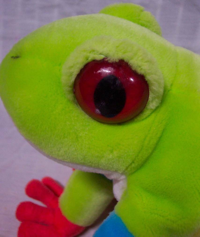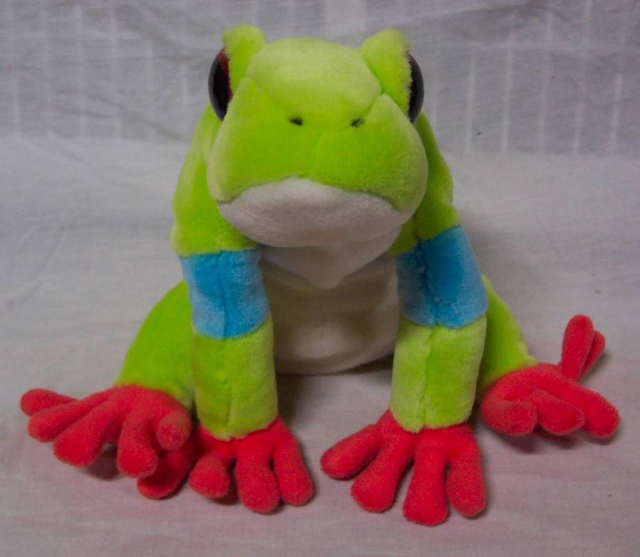 This is a LARGE COLORFUL TROPICAL TREE FROG Plush Stuffed Animal. Made by K M International in 2006. It is 9 inches tall and 12 inches long from front to back. It is in Great Condition. It is CLEAN! No Tears. There is a slight mark on the left eye, shown in picture below, but it might come off with the right cleaner. Combine auctions to save on shipping. Please contact me if you need to make other payment arrangements. AG