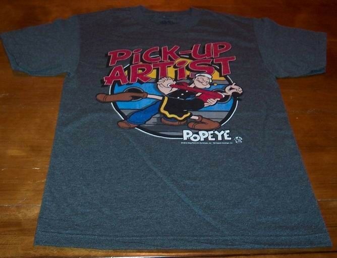 This is a VINTAGE STYLE Popeye The Sailor Man and Olive Oil PICK-UP ARTIST T-shirt. It is a size SMALL, and it is New. It is 18 inches from armpit to armpit and 27 inches in length. The print is made to look vintage. Winning bidder to add $5.50 shipping in the US(international will be more). Combine auctions to save on shipping. Winning bidder to e-mail within 3-days if not paying right away. Payment to be received within 10-days. D2AG