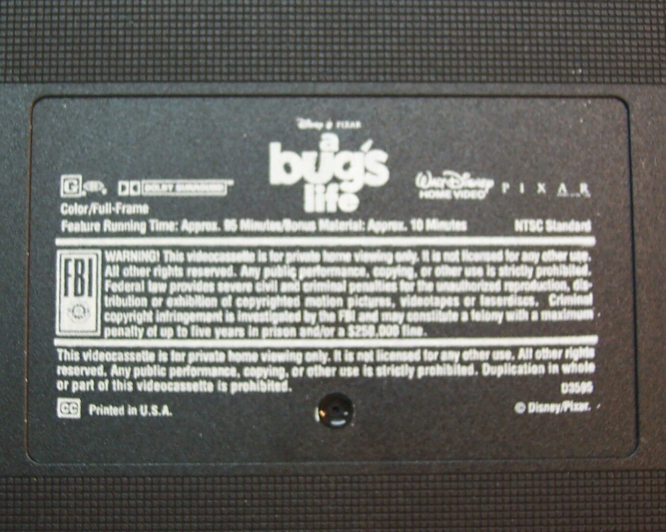 This is a Walt Disney Pixar A BUG'S LIFE VHS VIDEO Video. It has a run time of 95 minutes, plus about 10 minutes of bonus features. It is in good condition. The clam shell case has some slight wear/ bends on the edge.Combine auctions to save on shipping. Payment to be received within 10-days. AG