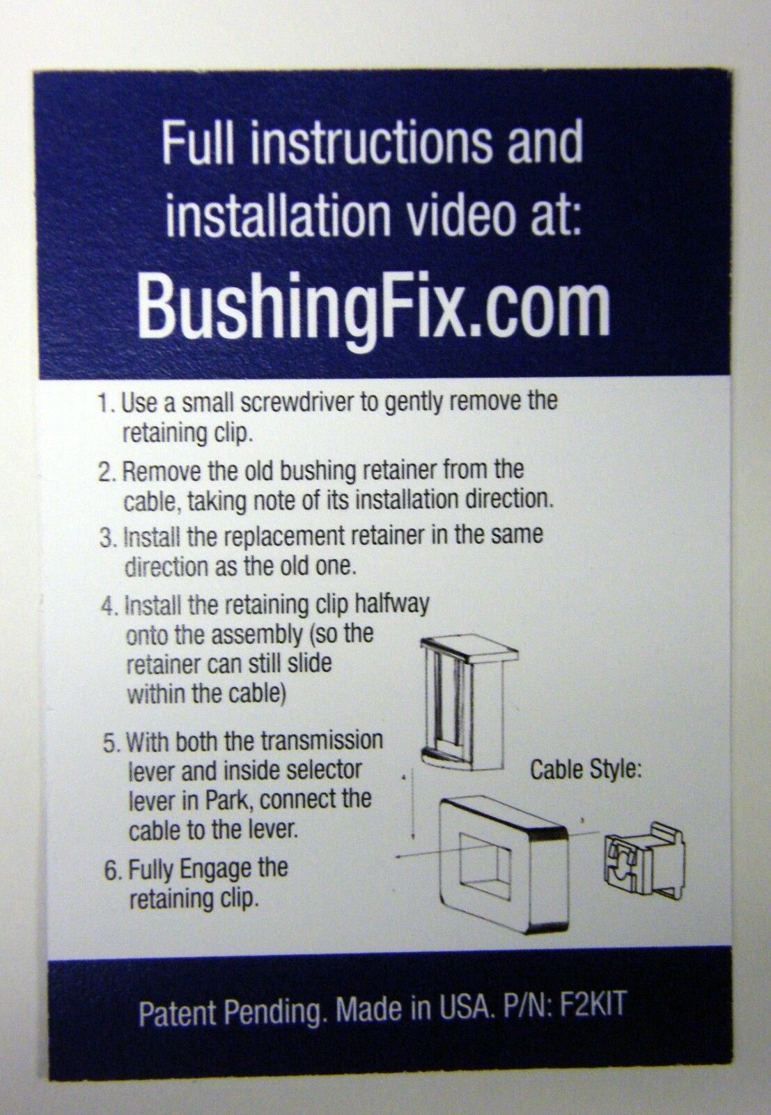The shift cable repair kit allows you to quickly and easily repair your shift cable by replacing the bushing. This is a complete shift cable repair kit engineered to provide a safe and effective means to replace the transmission bushing. Item includes not only a replacement bushing and the retaining clip. The patented (US Patent # 10,215,273 US Patent # 10,619,723) custom molded replacement bushing and retaining clip are designed to ensure a quality repair with ease. A professional can perform this repair in under 10 minutes, average time for a non-professional is less than 25 minutes.