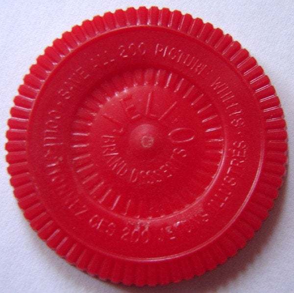 The picture shows the Old Jell-O Desserts Premium Automobile Token Coin. One is flipped over to show the wheel design on the back side. This coin is made of red colored plastic.