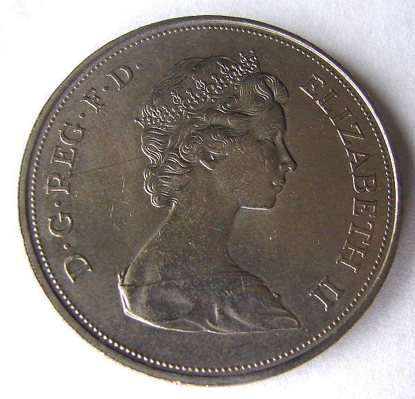 OBVERSE: The second (decimal) portrait of the Queen facing right, designed by Arnold Machin.