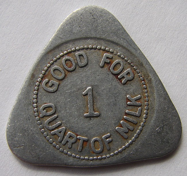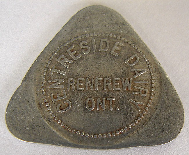 I am offering the 1940s An aluminum milk triangular token "Centreside Dairy Renfrew Ont." on the one side - "Good For One Quart of Milk" on the other side.
