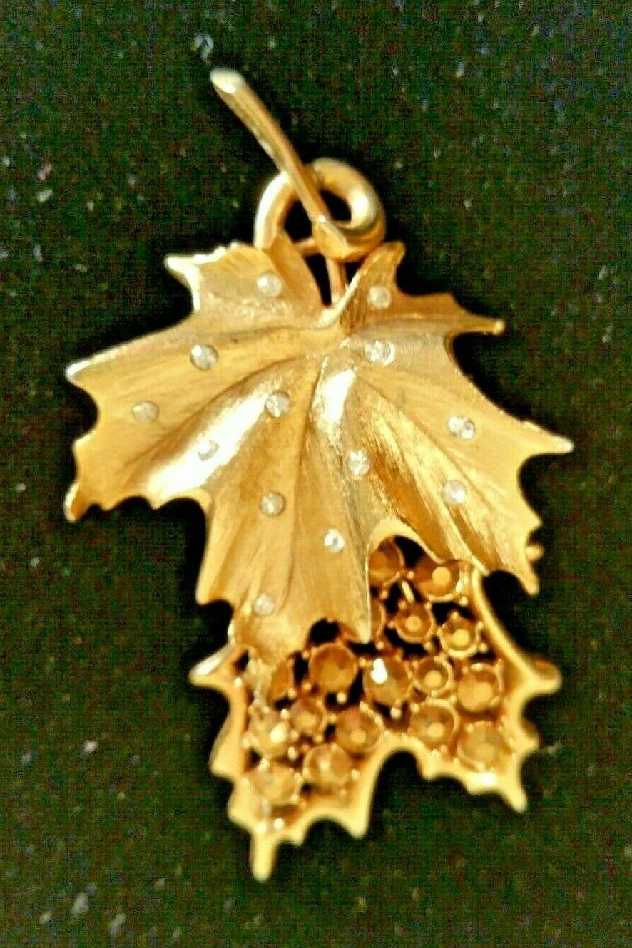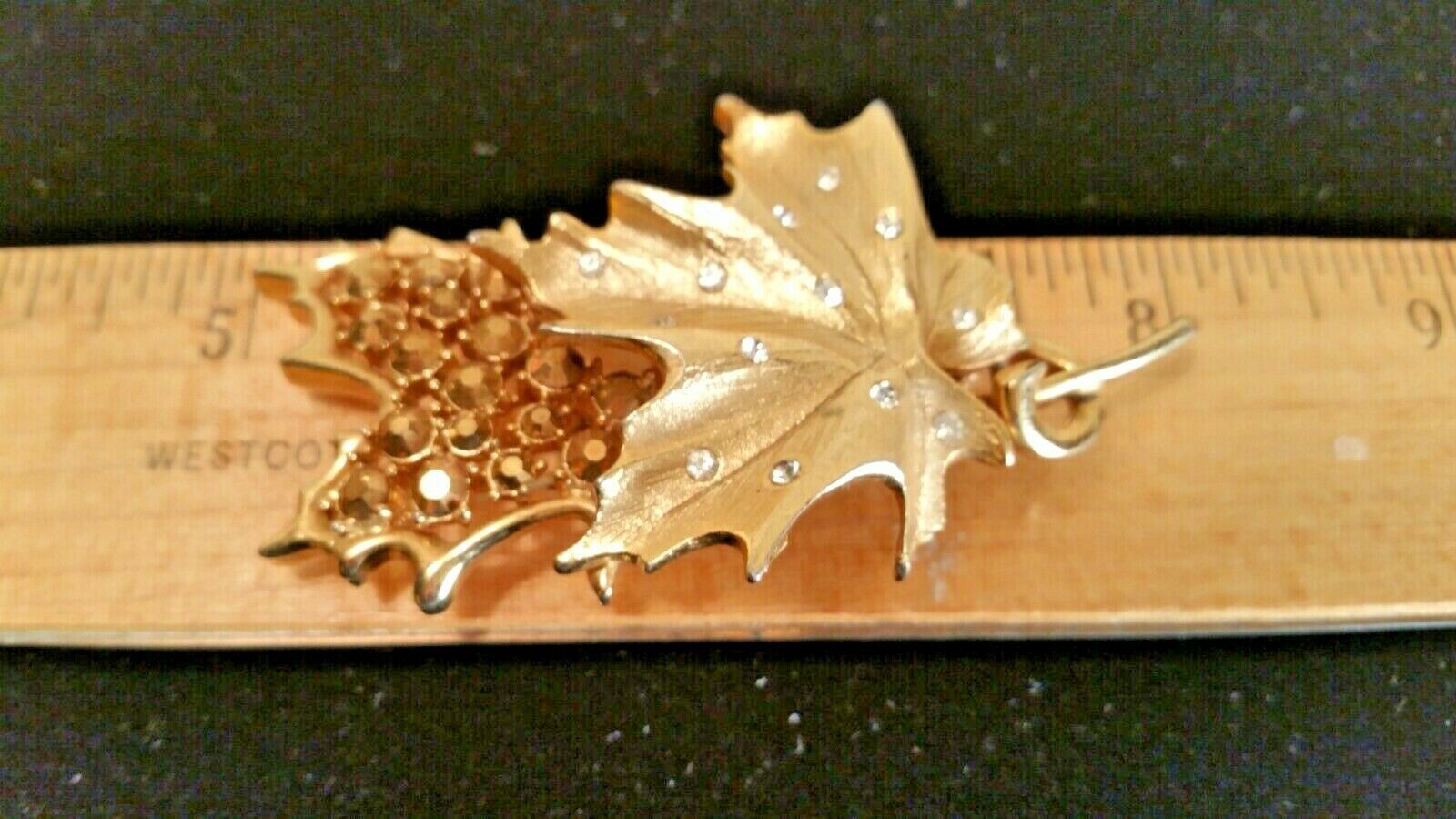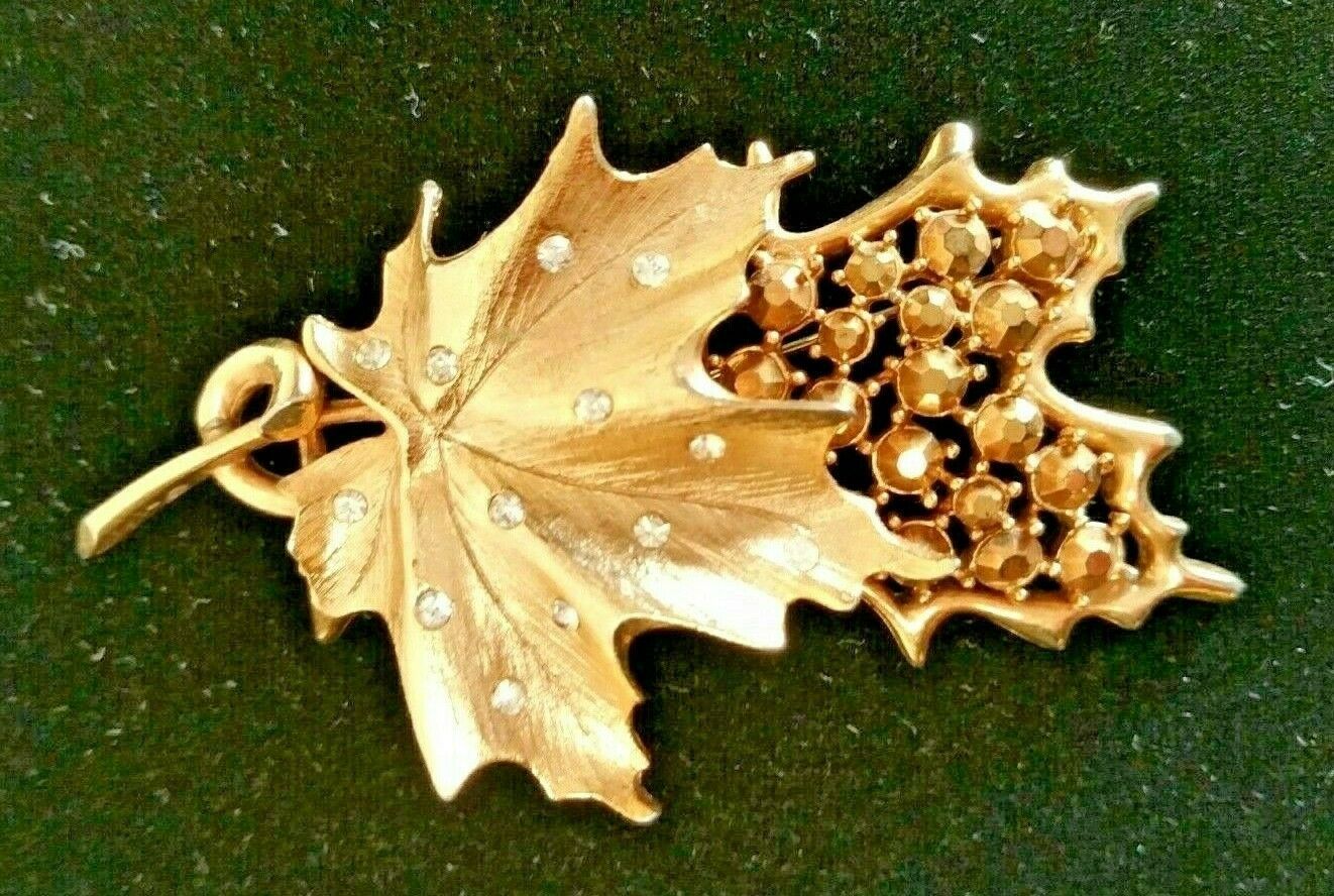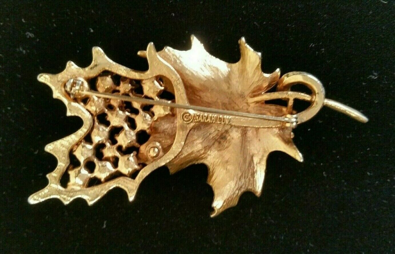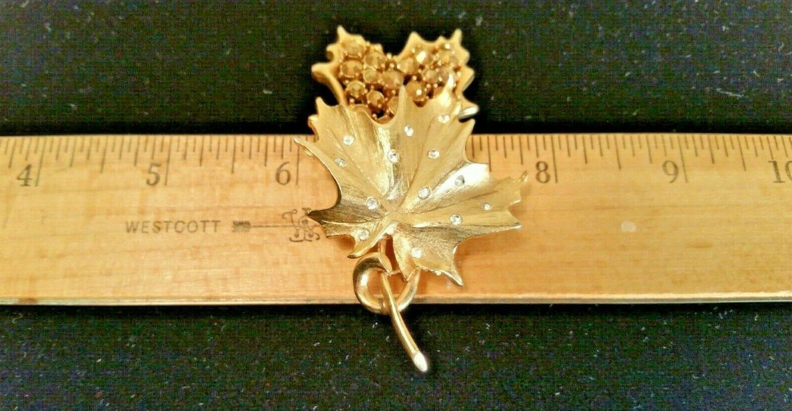 Vintage Sarah Coventry Signed Gold Tone Leaves and Rhinestones 3" Brooch Pin
