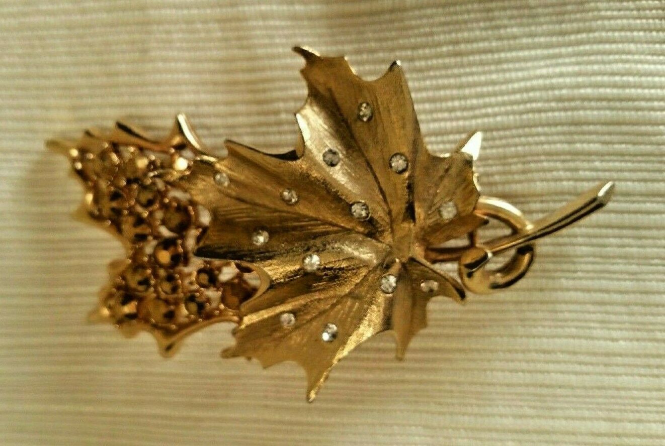 Vintage Gold Tone Leaves and Rhinestone Brooch Pin