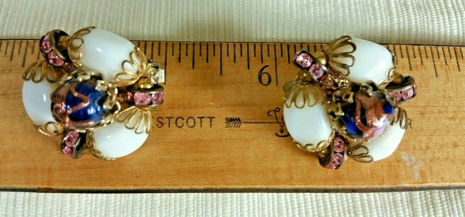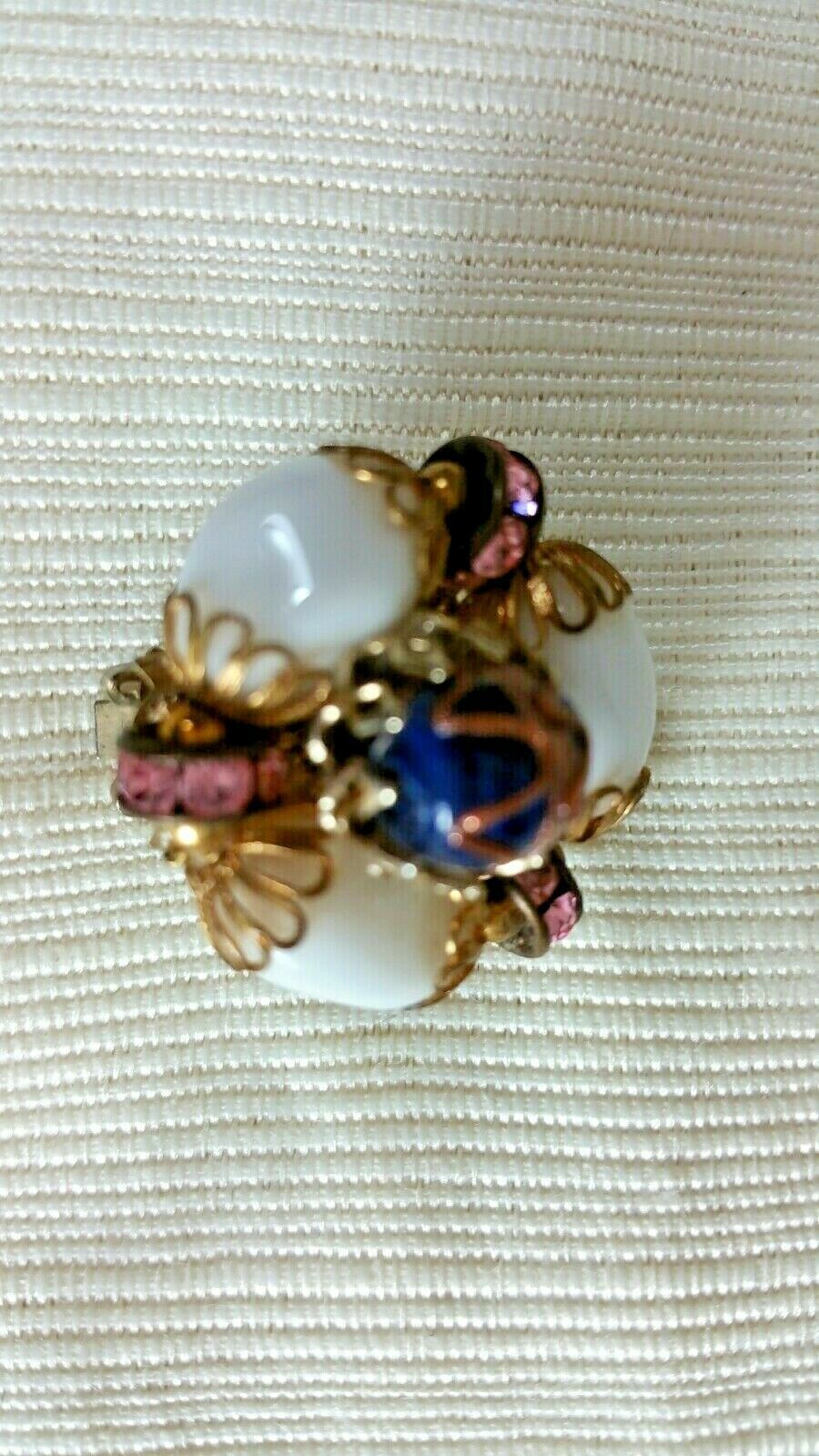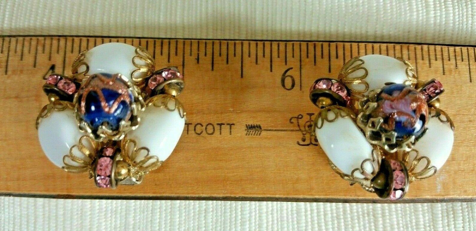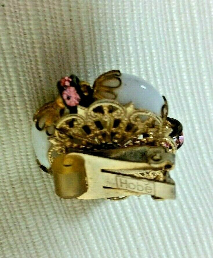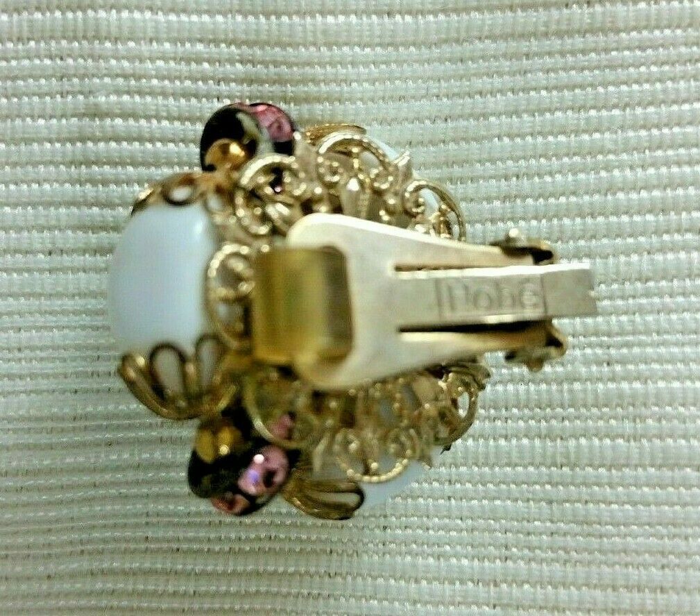 Vintage HOBE Gold Tone Clip On Earrings White Glass Pink Rhinestones Murano Bead