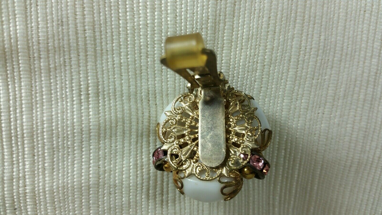 - Murano Glass Beads, White Elongated Glass Beads, and Pink Rhinestones Set on a Filigree, Open Work, Gilt Back Metal Base