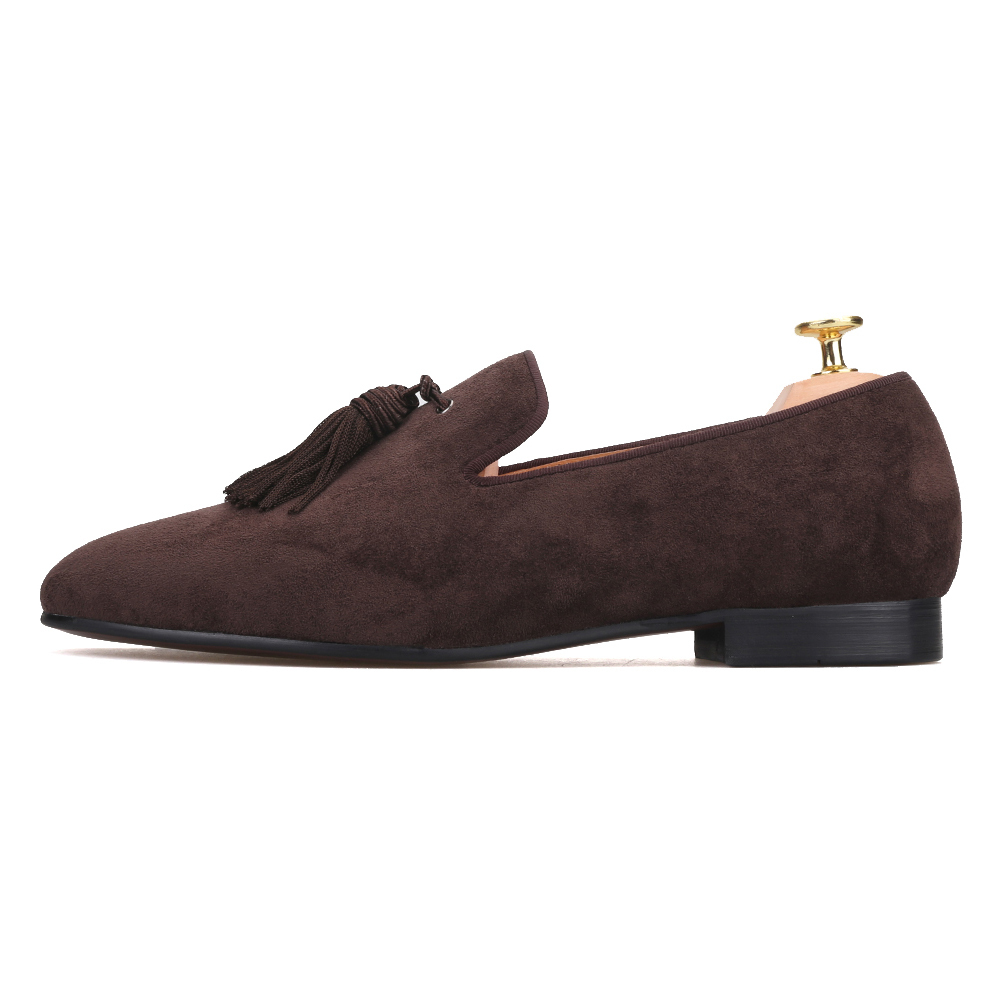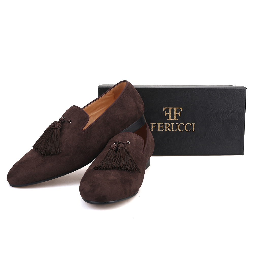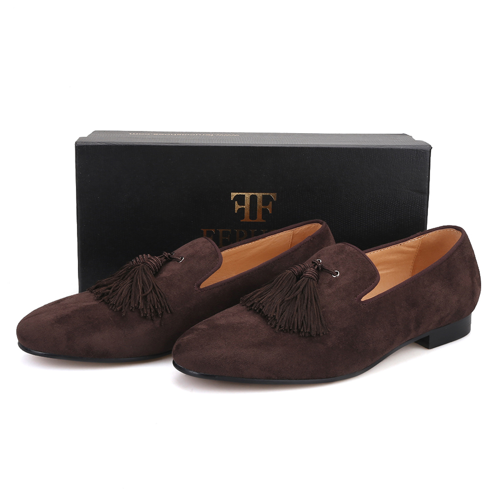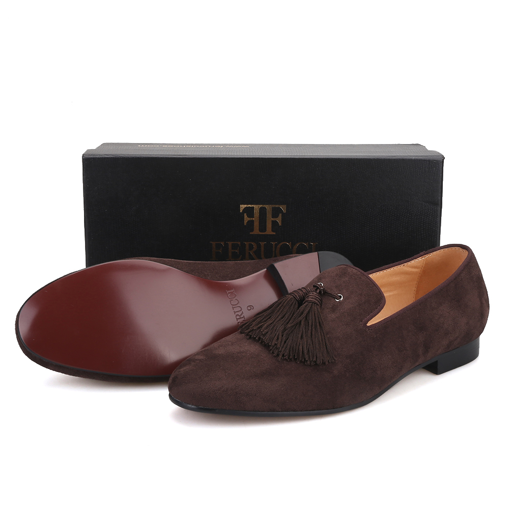 Handmade Men FERUCCI Brown suede with Big Brown Tassel Slippers loafers Flat