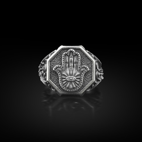 The featured ring is cast in oxidized-finish .925 sterling silver and showcases a hamsa hand charm centerpiece finished with a plain flat band.