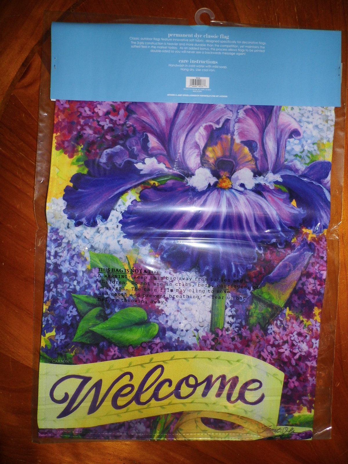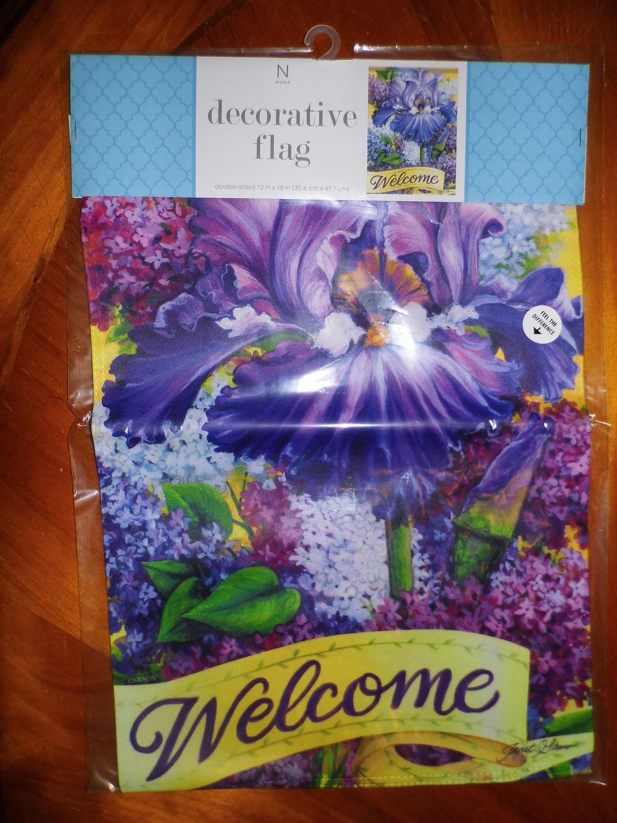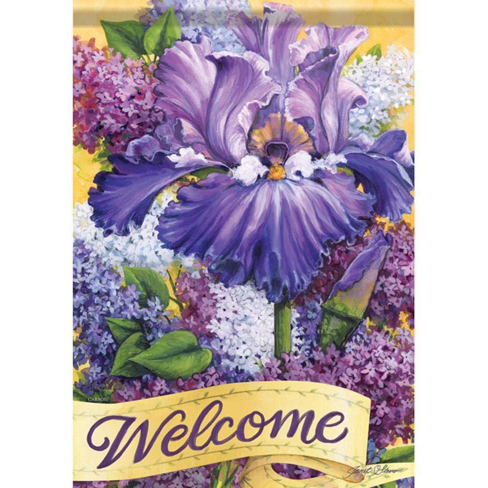 Lilac Blossom Welcome Garden Flag measures 12" x 18" by Carson. "Welcome" reads correctly on both sides. This decorative summer garden flag features a bold and flashing array of lilac blooms with a "Welcome" caption near bottom border. Vibrant colors and detailed outdoor yard flag that will complement any landscape. Pretty background with exceptional and unique design. Artwork by Janet Stever