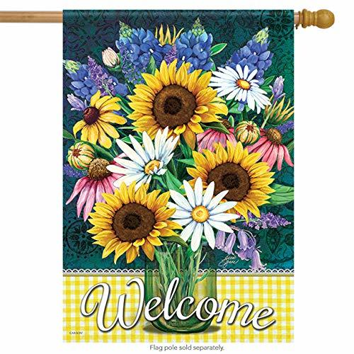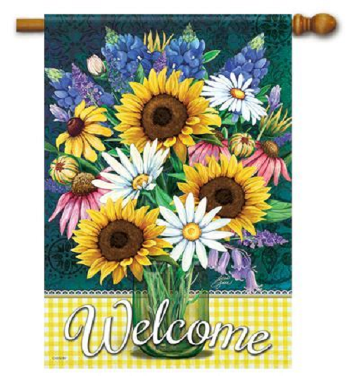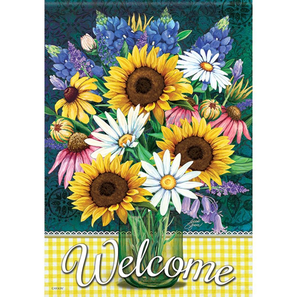 Sunflower Bouquet Decorative House Flag measures 28" x 40" by Carson. "Welcome" reads correctly on both sides. This decorative spring/summer house flag features a lively assortment of sunflowers, daisies and cone flowers inside a glass vase, is a great visual treat! Caption "Welcome" is shown near bottom border. Vibrant colors and detailed outdoor yard flag that will complement any landscape. Pretty background with exceptional and unique design. Artwork by Gina Jane. Flagpole not included.
