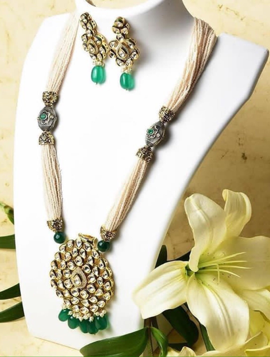 VeroniQ Trends-Indian Long Rani Haar Kundan/Polki Necklace Set in Emerald,Pearls