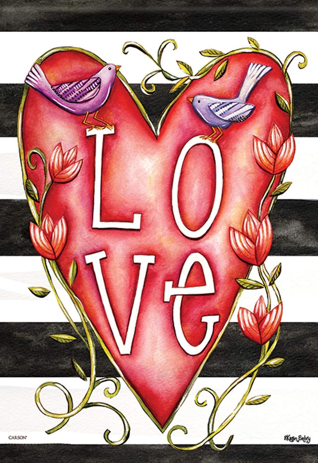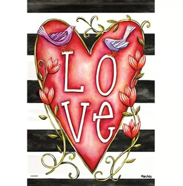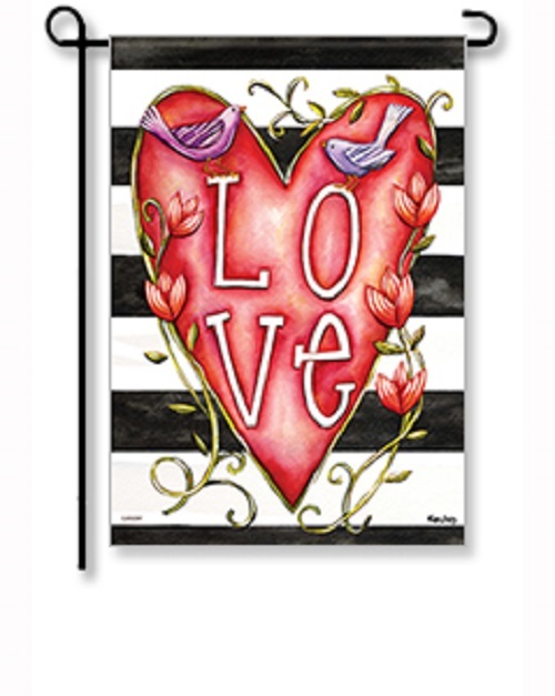Valentine Love Garden Flag measures 12.5" x 18" by Flag Trends. Make a bold statement with this large red heart with black and white striped Valentine Flag. Vibrant colors and detail. A festive Valentine flag to display in your yard to wish everyone Happy Valentine's Day. "LOVE" reads correctly from both sides. Created by Artist Karen Embry. Perfect flag to give as a Valentine's Day gift. Flag stand not included.