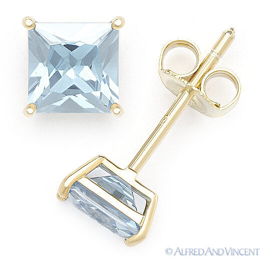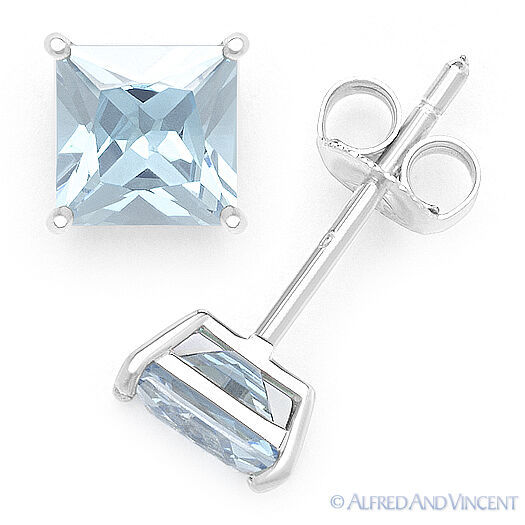 The featured pair of earrings showcase square cut light blue cubic zirconia crystals set in 4-prong basket settings cast in .925 sterling silver . The earrings are then finished with push-backs so they can be worn securely on your ears.