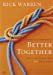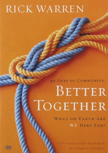 Product description: The Better Together DVD part of the Living with Purpose series is a dynamic individual or small group DVD study from Rick Warren. In each session you will learn how to fulfill God s five purposes for your life. Each session also includes the biblical support behind each purpose the ways it applies to you and your circle of influence and how you can use this knowledge to benefit God s kingdom. From the beginning God planned for Christians to fulfill his purposes in munity with each other in our church families small groups and in the world as a whole. Why did God plan it this way? Because we re better together!Better Together will deepen your understanding of how God uses munity for your own good and growth as well as help you cultivate deeper relationships with those around you. Learn to fulfill God s purposes discover how we are better together. Better Together DVD sessions include: Session 1: What Matters Most 25 mins. Session 2: Reaching Out Together 24 mins. Session 3: Belonging Together 22 mins. Session 4: Growing Together 27 mins. Session 5: Serving Together 18 mins. Session 6: Worshiping Together 24 mins. This DVD is designed for use with the Better Together Devotional Journal and Better Together Study Guide.Format: DVD MOVIE Genre: INSTRUCTIONAL Rating: NR Age: 025986326821 UPC: 025986326821 Manufacturer No: BETTERTO