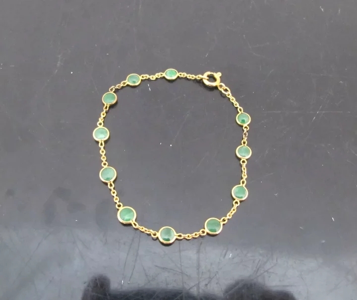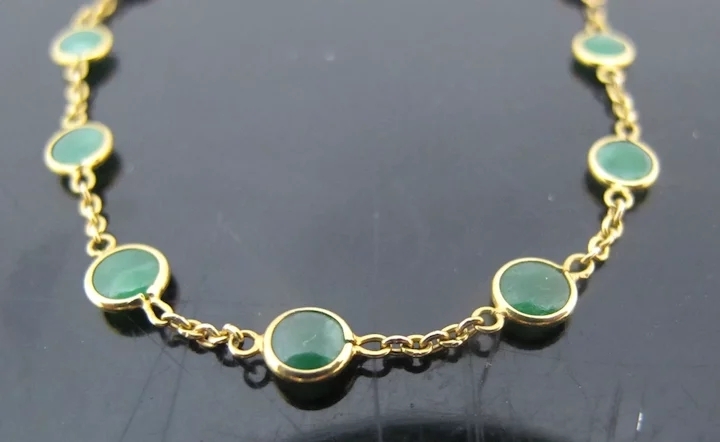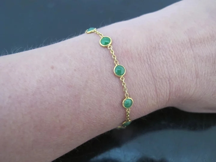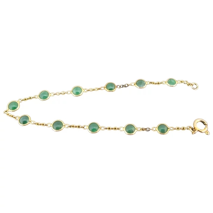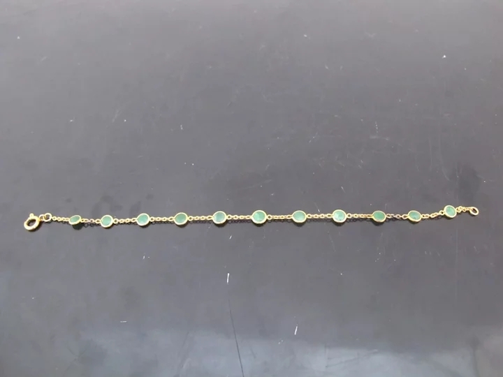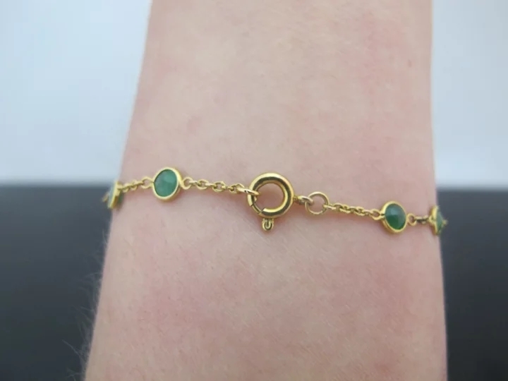 Very sweet and dainty 14k yellow gold (tested and guaranteed) chain bracelet 11 green jade gemstones measuring approximately 3.5 mm. Bracelet total length of 6.5".