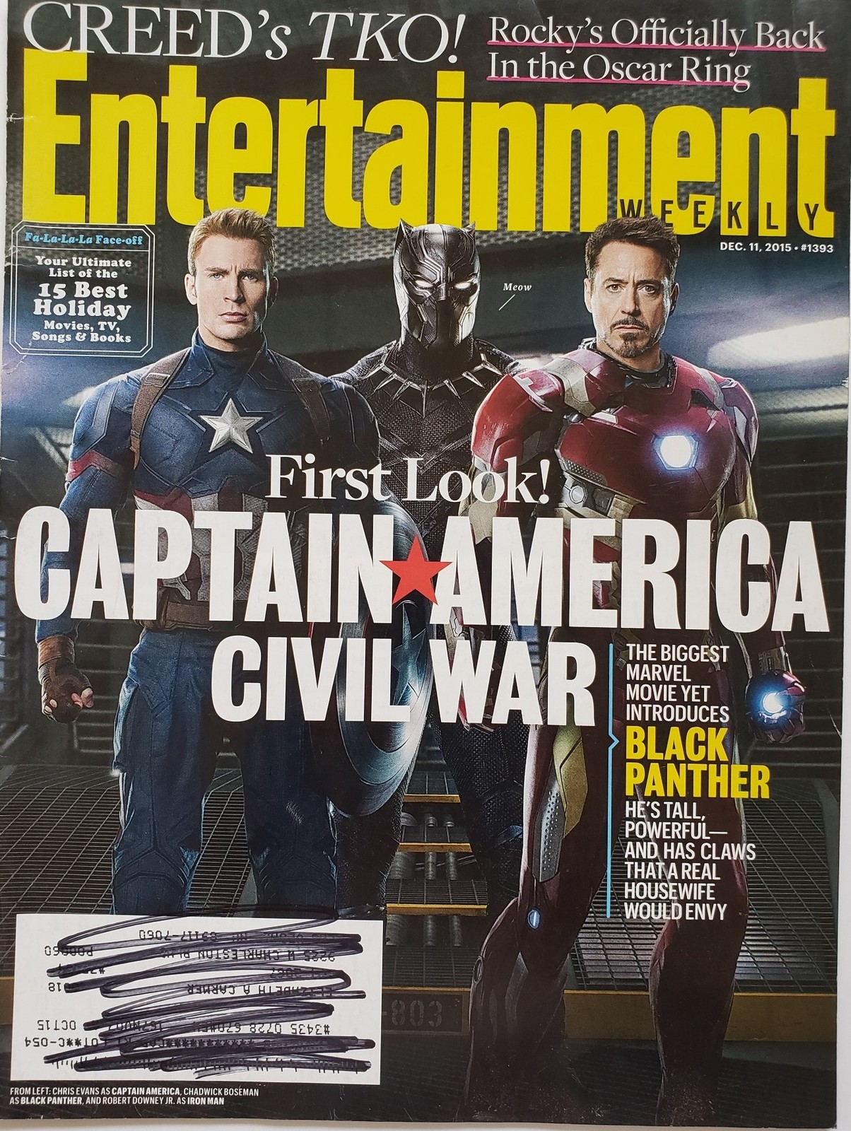 Entertainment Weekly December 11, 2015, features on cover, First look of Captain Amerca - Civil War. Featuring Robert Downey Jr. as Iron Man, Chris Evans as Captain America, and Chadwick Boseman as Plack Panther.