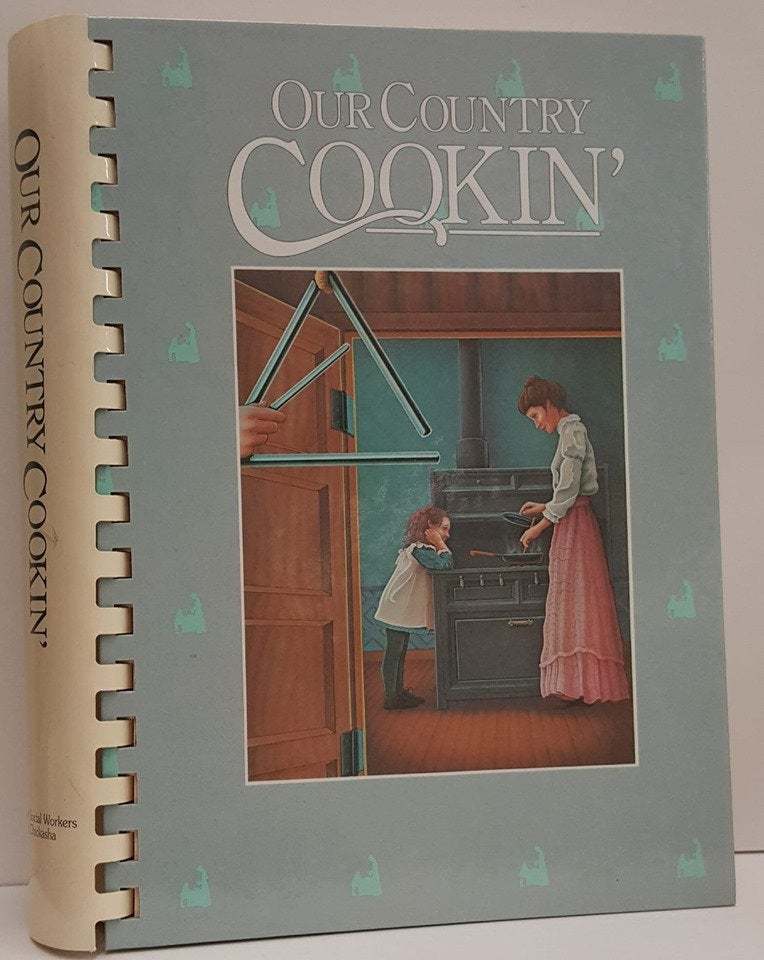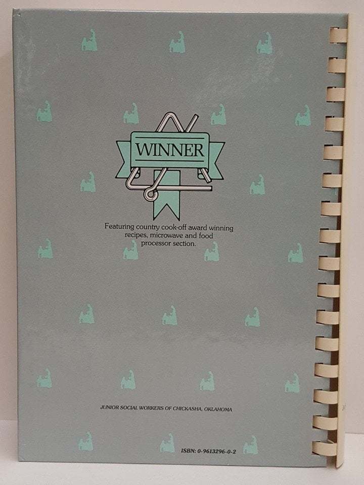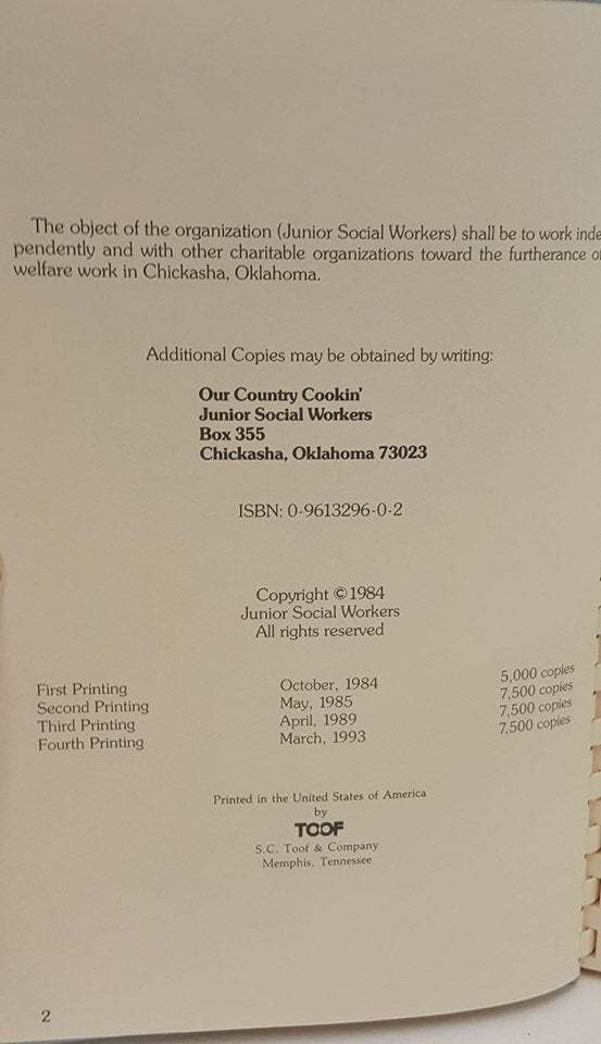 Our Country Cookin' is a classic collection of over 500 country recipes. These have been carefully home tested and proudly presented by the Junior Social Workers of Chickasha, Oklahoma. Copyright 1984. Fourth printing, 1993. ISBN 0-9613296-0-2.
