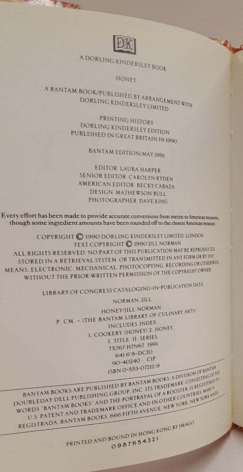 Honey - Natural Sweetness from Flowers, Herbs and Trees by Jill Norman from the Bantam Library of Culinary Arts. A Bantam book published by arrangement with Dorling Kindersley in 1990. ISBN 0-553-07212-9.