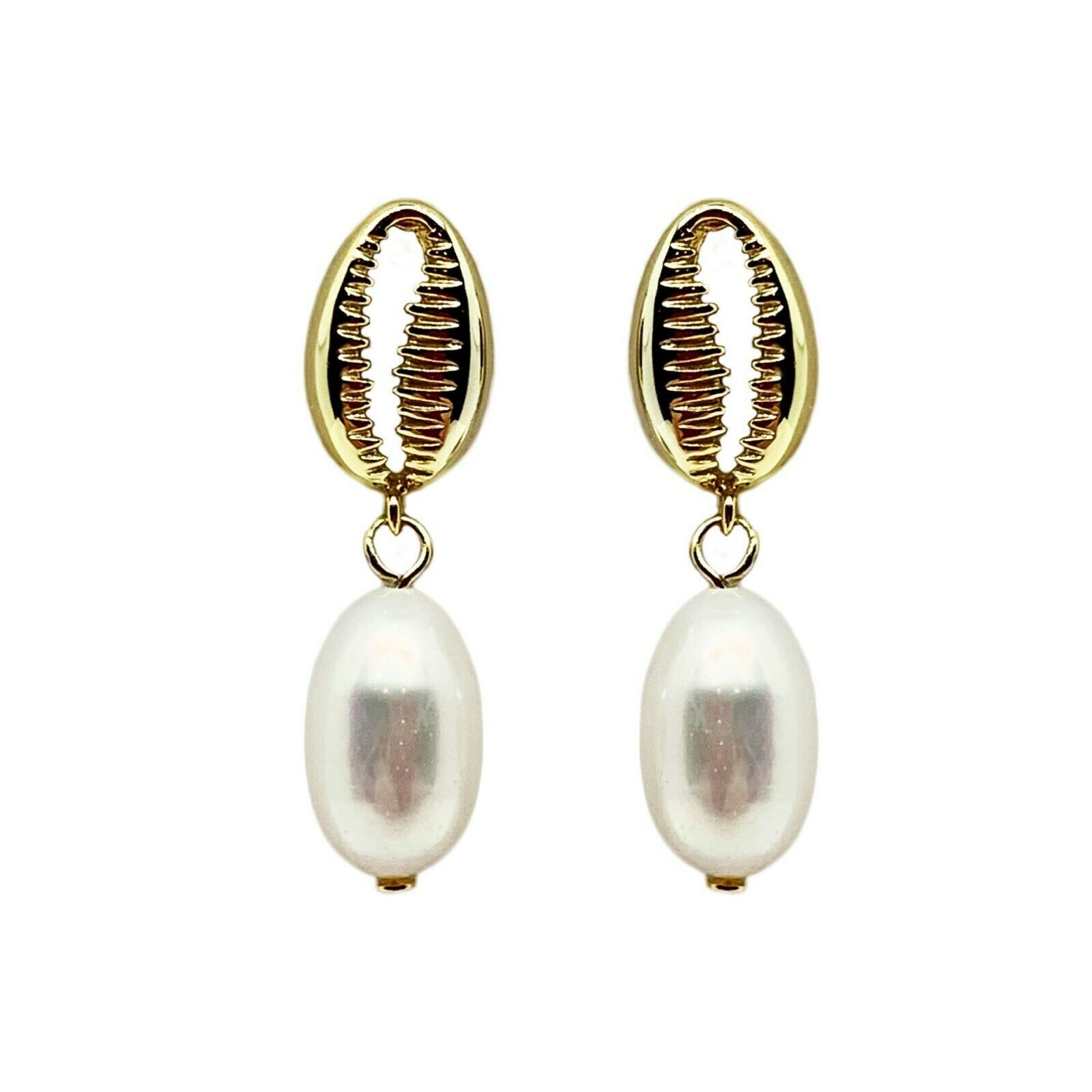White oval freshwater pearl cowry cowrie sea shell conch ocean bay yellow gold plated 925 sterling silver dangling earrings 1.25"